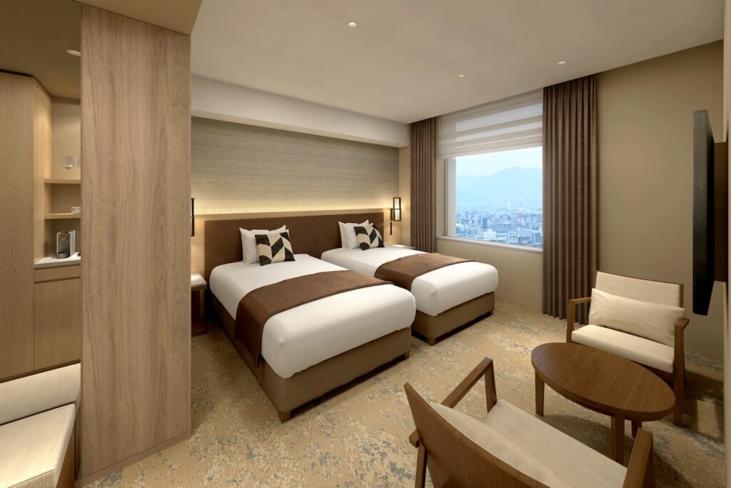 福岡は古くからアジアをはじめ国際交流が盛んで、積極的に他国の文化を受け入れてきた「国際都市」。福岡の「活気・活発を感じさせる雰囲気(活)」と「才知・才能を感じさせる雰囲気(才)」の二面性をコンセプトに、ホテルはデザインされています。主力客室は、伝統文化や国際交流で賑わう福岡の「活気・活発」と商人の町として栄えた福岡の「才知・才能」を感じさせる2パターンのデザインを用意。他、計6種類のタイプからお部屋を選ぶことが可能です。福岡を見渡せる素晴らしい景色と、伝統と文化を感じる空間で非日常を楽しんで。