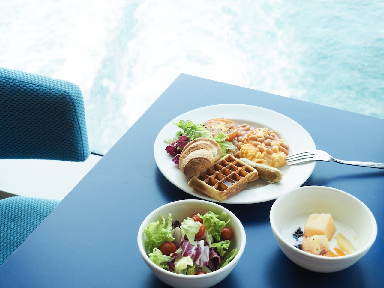 朝・昼・晩、加え、モーニングティー、アフタヌーンティー、24時間スナックと一日最大6食まで無料で利用できる「リド」は、西洋〜東洋のお料理が並ぶビュッフェ形式のレストラン。アジアがベースとなっているので、日本人にも親しみやすい味。品数も多いのでどれを食べようか迷っちゃう!スパイスの効いた美味しいインドカレーなどもあるので、異国の味も堪能できます。窓から見える海を眺めながらの朝食は、なんともラグジュアリーで幸せ。