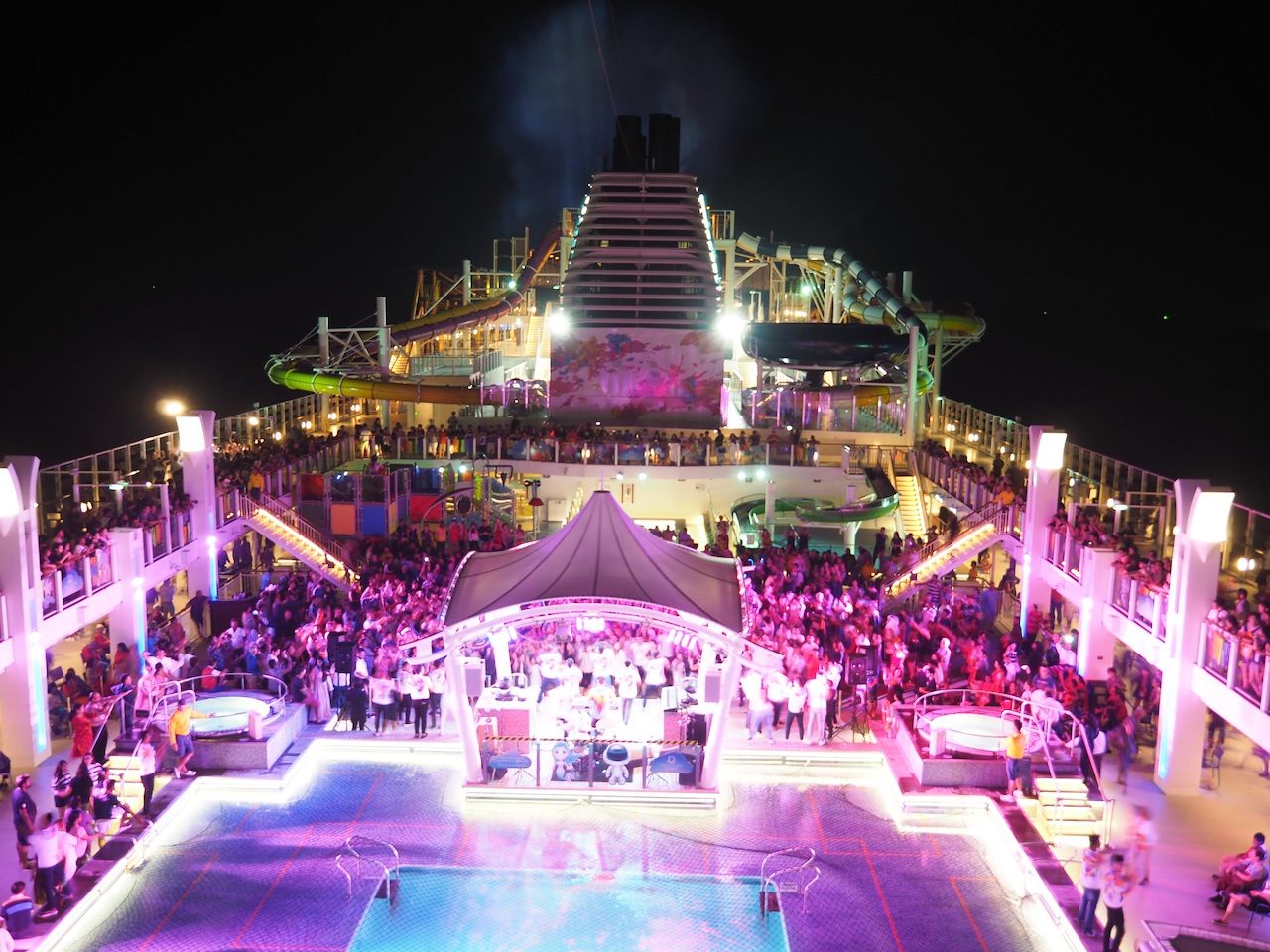 楽しかったクルーズ船の旅もついに最後の夜。コース最終日には、メインデッキにて無料イベント「Colour My World」が開催されます。船上で鳴り響く音楽と、夜空を照らすダイナミックな花火を見ながら、最後の夜を満喫!