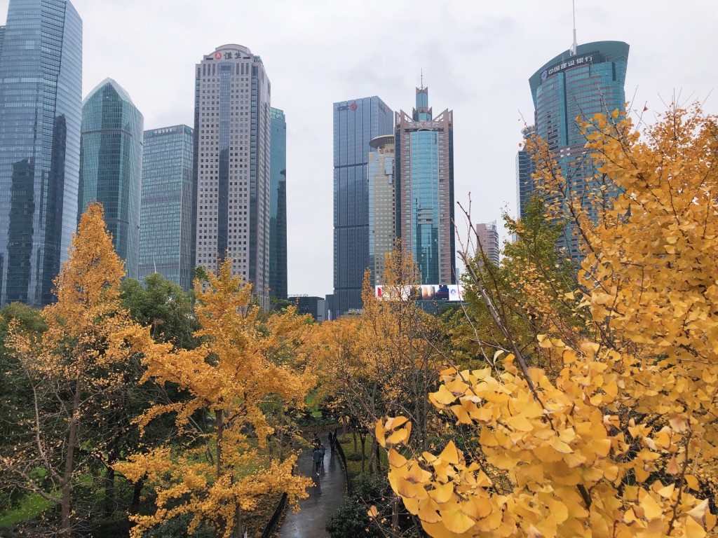 高層ビル群がそびえ立つ浦东(プードン)エリアに位置する緑いっぱいの公園「陆家嘴中心绿地(Lujiazui Central Green Space)」。よく整備されていてベンチもあるので、のんびり静かに紅葉を眺めることができます。