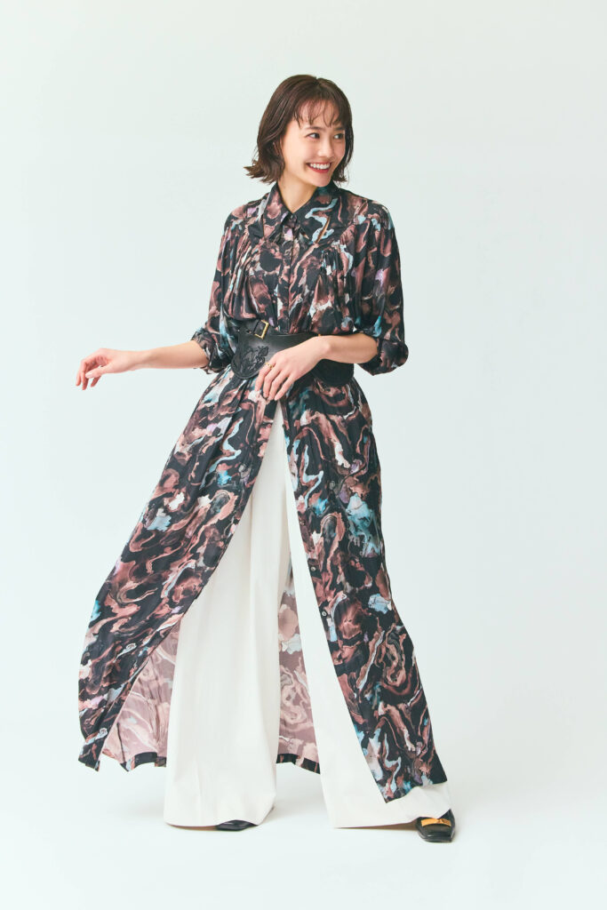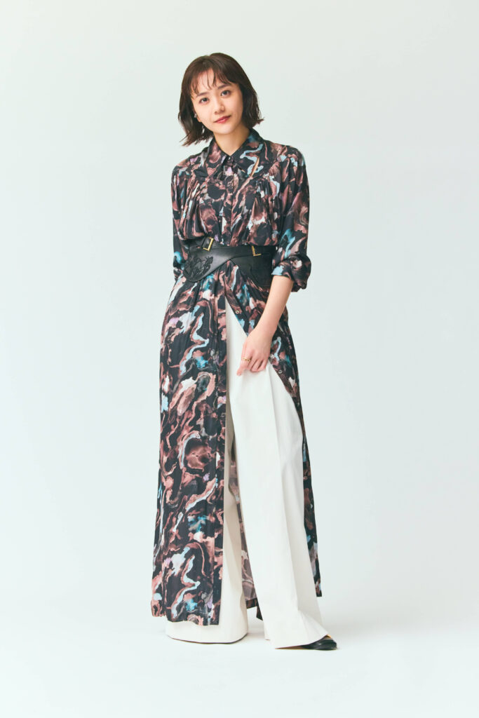 シャツドレス¥69,300ワイドスラックス¥44,000レザーベルト¥55,000(すべてミューラル/ザ・ウォール ショールーム)イヤリング¥24,200(スワロフスキー・ジュエリー/スワロフスキー・ジャパン)ゴールドのイヤーカフ¥27,300ゴールドのリング(左手人差し指)¥231,200シルバーのリング(右手中指)¥48,400(すべてトムウッド/トムウッド 青山店)フラットシューズ¥122,100(セルジオ ロッシ/セルジオ ロッシ カスタマーサービス)