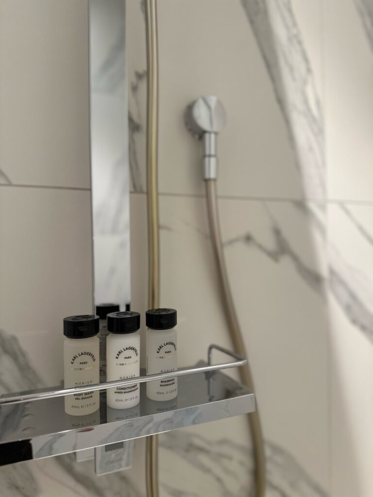 一面の窓から自然光が差し込むモダンな室内。ベッド裏には広い書斎があり、作業も捗ります。身支度中の気分が上がるオシャレな大理石調の洗面台の奥にはシャワールーム。バスアメニティは高級感溢れるカール・ラガーフェルドのもの。