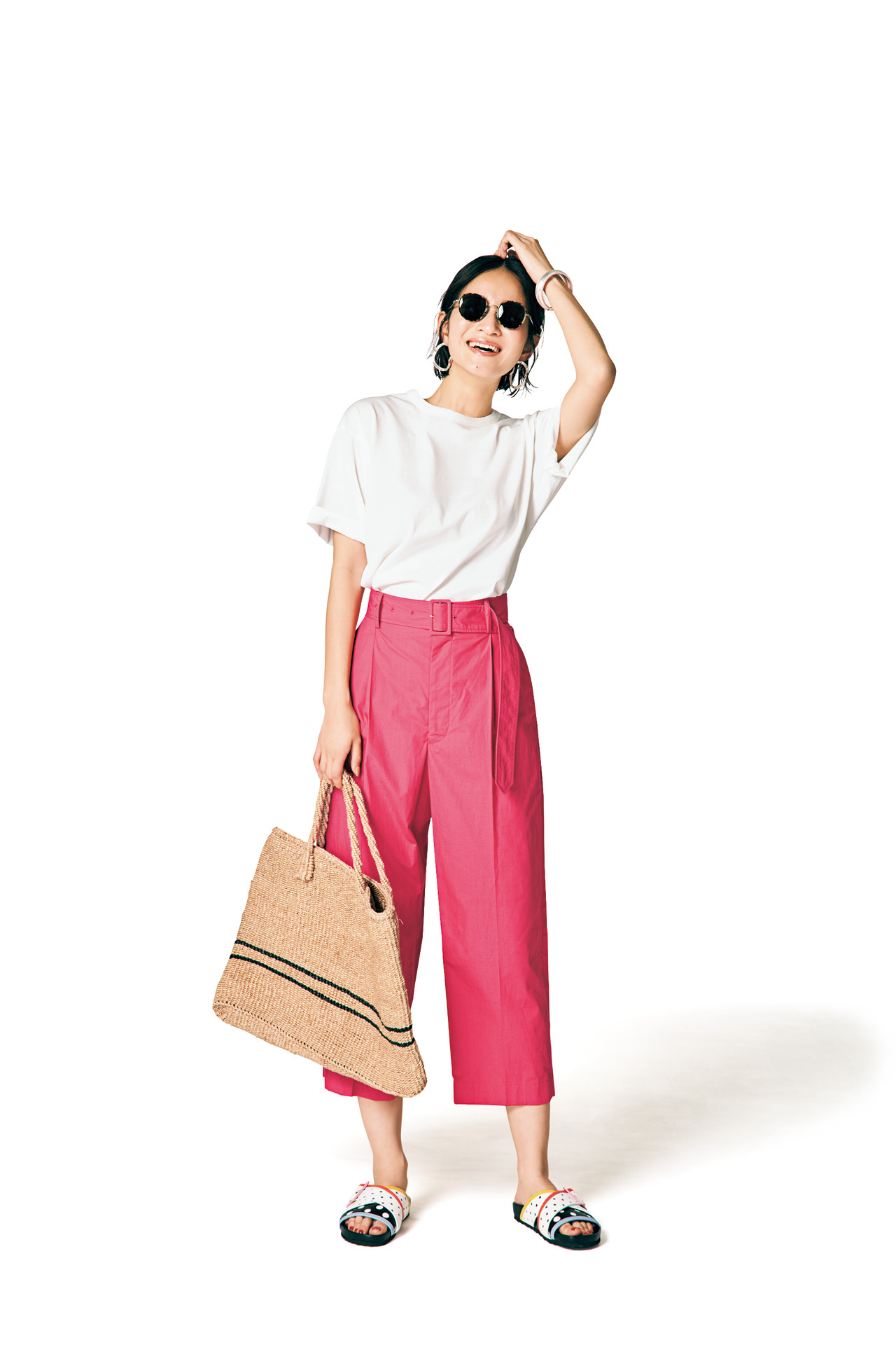 「やっぱり女性が着る白Tはいいですね。ピンクも淡いよりこのくらいビビッドな方が大人の女性という感じがして好きです。可愛らしい色もちょっとボーイッシュに着こなしていると、逆にグッときます」サンダル¥55,000(ピエール アルディ/ピエール アルディ 東京)Tシャツ¥12,000(サクラ/インターリブ)パンツ¥28,000(イレーヴ/アングローバル)バッグ¥18,000(ノロ/アパルトモン 青山店)サングラス¥39,000(アイヴァン/アイヴァン PR)ピアス¥5,834バングル¥4,000(ともにアビステ)
