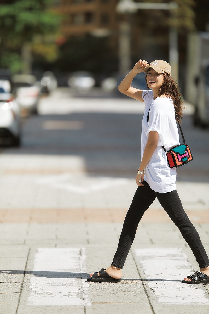 「ドレスアップしているよりも、見ていて楽そうなスタイリングが好きです。着こなしはラフなんだけど、素材にはこだわっていて上質感があったり、バッグやアクセサリーがハイブランドで華があったりと、全体的にバランスの取れたスタイリングに惹かれます」Tシャツ¥9,000(アッパーハイツ/ゲストリスト)パンツ¥23,000(ジョーズ・ジーンズ/エドウイン・カスタマーサービス)帽子¥3,800(ニューエラ)バッグ¥101,000(ピエール アルディ/ピエール アルディ 東京)サンダル¥18,500〈カミナンド〉ピアス¥13,000〈フィリップ オーディベール〉(ともにラヴァンチュールマルティニーク)バングル¥25,000(ノース ワークス/UTS PR)