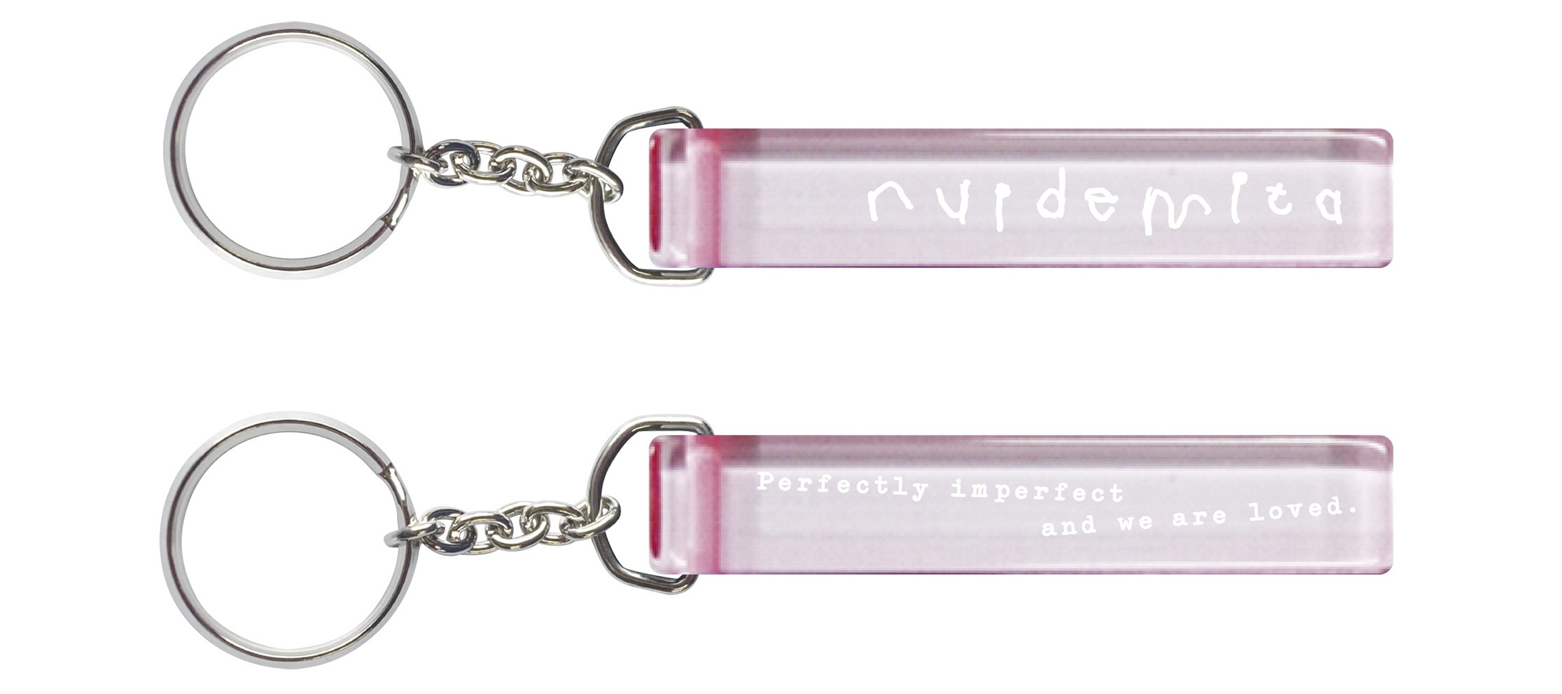 写真集のみに加え、オリジナルキーホルダーつきも販売されます。両面に印字がされた、まるでホテルのキーのような、長さ8cmのキーホルダー。「Perfectly imperfect and we are loved.」=「私たちは不完全さごと愛されている」という花盛友里からのメッセージが書かれています。