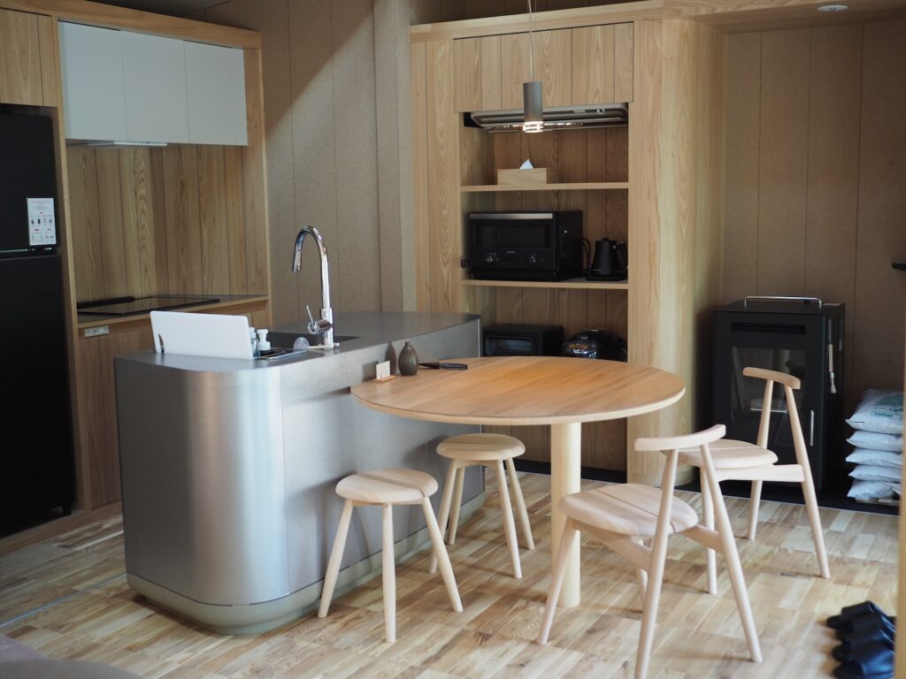 キッチンにはIH、冷蔵庫、調理器具、簡単な調味料も完備。食材を買ってきてそのまま自炊も可能。さらにスピーカーやプロジェクター、本棚まで用意されていて、自然の中でも“自分の時間”が楽しめる工夫が詰まっていました。また、掃除や管理といった面倒な手間は一切ありません。到着したらすぐに使えるようになっており、チェックアウト後の掃除も必要無し(使った食器の洗浄やゴミ出しのみ要対応)。管理に手間が掛からないのも嬉しいポイントです。