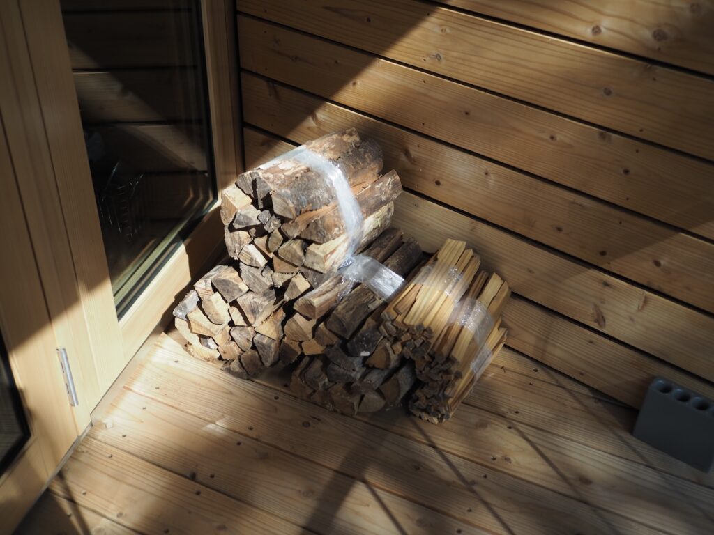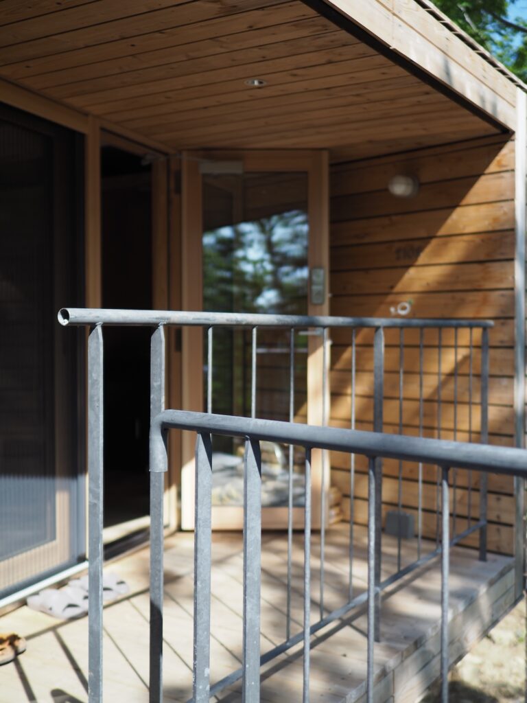 自然に囲まれたキャビンに到着。荷物を置いて、テラスで一息。