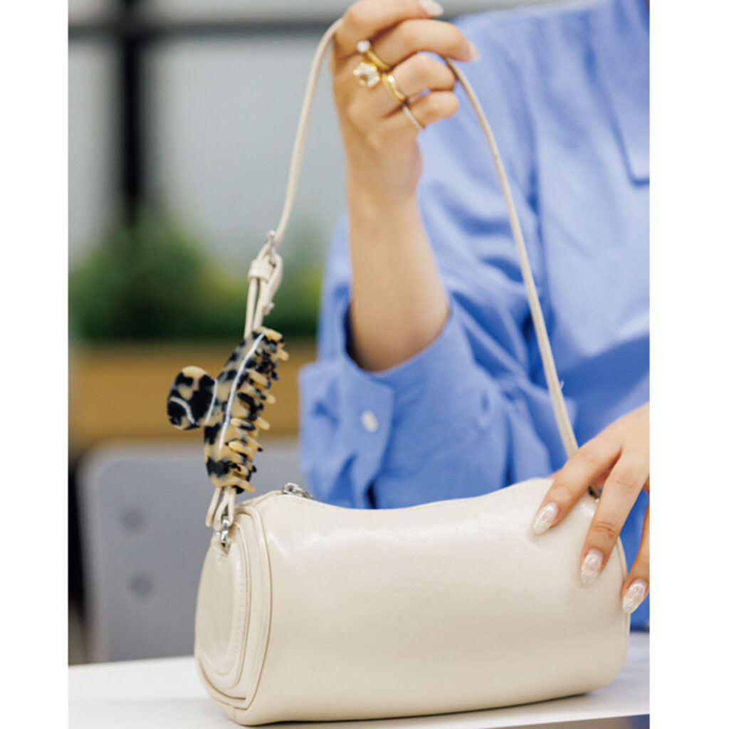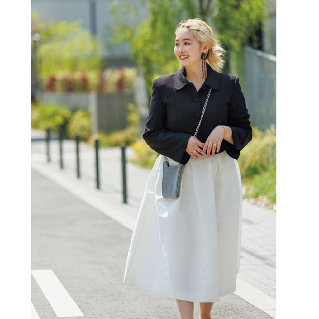 万人ウケのいいシャツスタイルは、マーベルトデザインのスカートやキトゥンヒールを合わせてトレンド感もキープ。気分の上がる小物でお仕事の日も華やかな気持ちに。