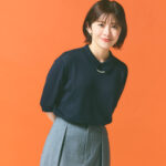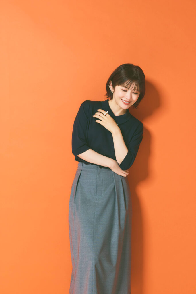 ニット¥40,700 スカート¥44,000(ともにジョン スメドレー/リーミルズ エージェンシー) リング¥49,500 イヤカフ¥29,700(ともにカラットアー/イセタンサローネ東京) ネックレスはスタイリスト私物