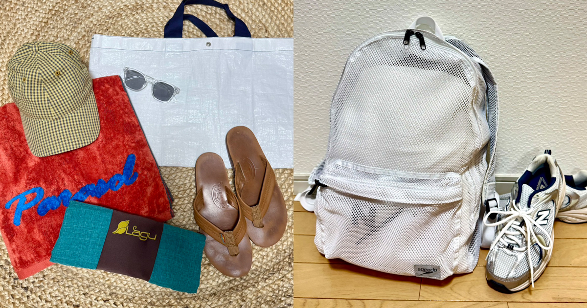 場所をとるバッグも、コンパクトになるものを持参。汚れてもすぐに拭ける素材のエルベシャプリエの白トートや、メッシュ素材で通気性がよく、洗濯機でも洗える軽量のSpeedoのリュックを愛用しています。海に行く時に飲み物を入れたり、生の食材買ったときに便利な保冷バッグも南国旅の必需品。鎌倉にあるLONG TRACK FOODSというショップで購入した保冷バッグは、折りたためるので場所をとりません◎