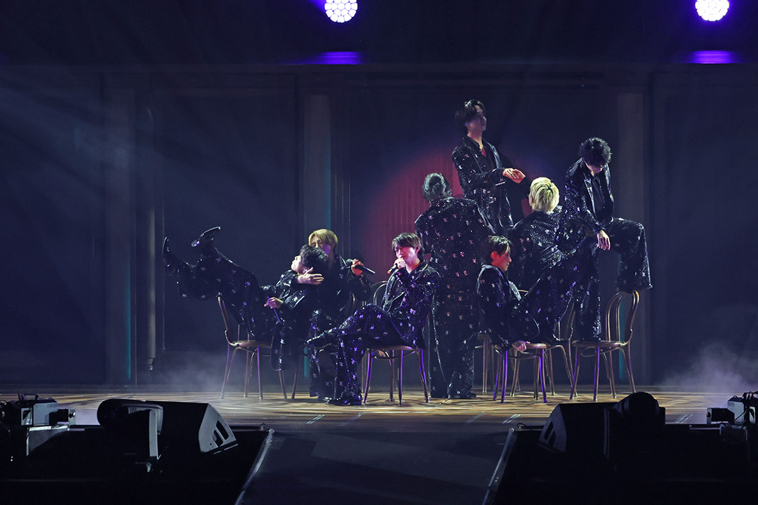 『本音と建前』では、椅子を用いた演出に大人の色気が止まらない8人。艶やかに絡み合うメンバーに思わず会場も息を漏らします。『革命のDacin’ night』では、会場がショータイムのような煌びやかな世界観に一変。2段にせり上がった円形のセンターステージで360度楽しませます。そのトップに君臨する佐藤さんは、まるで王者の風格。“これぞ伝統!”なパフォーマンスで観客を魅了しました。