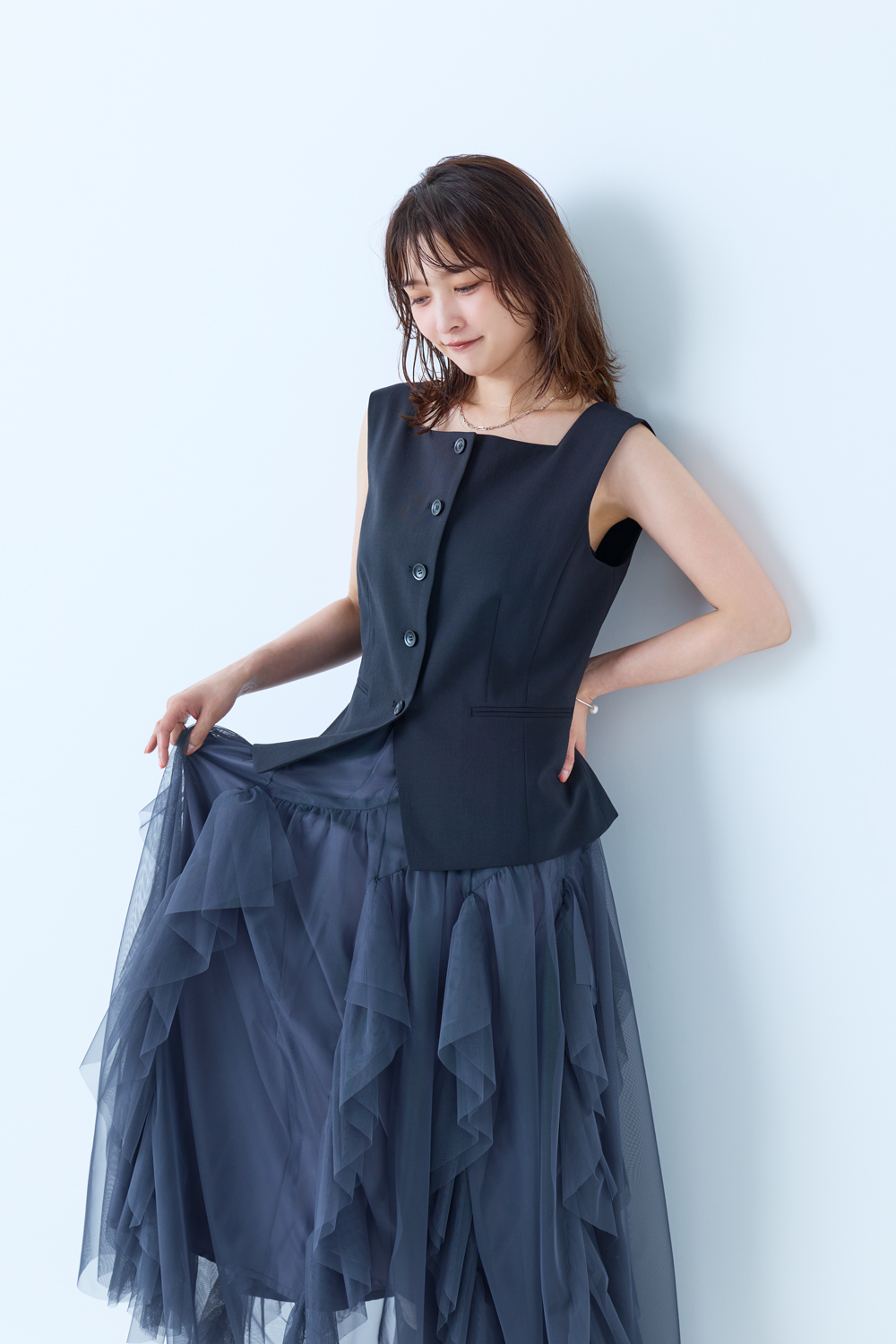 ジレ¥19,800スカート¥24,200(ともにアルページュストーリー/アルページュストーリー プレスルーム)サンダル¥17,050(ダイアナ/ダイアナ 銀座本店)イヤーカフ¥25,300<Pearl for Life>ネックレス¥14,520<ポピー・ケー>バングル¥13,200<オーロラ>リング¥12,000<Maria Jewelry>(すべてロードス)