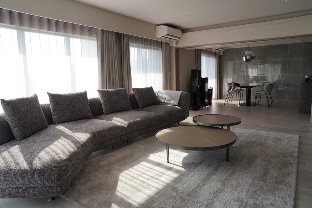 「友人たちがいつでも遊びに来やすいように、白・黒・グレーで統一したインテリアを選んで、すっきりとしたホテルライクな空間に。キッチンは収納棚を開閉式にして、家電類は中に収めて生活感が出ないように工夫しました」