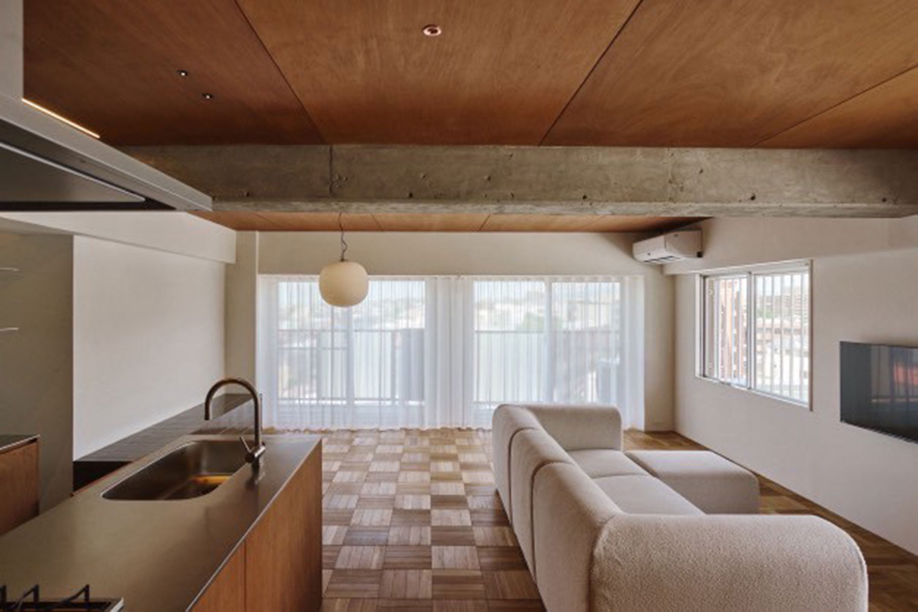 「安心感と緊張感の合間をテーマに、とことんヴィジュアルを2人好みに追求。木製床やコンクリートの梁あらわし、白ソファなどをMIX」