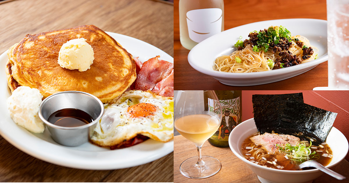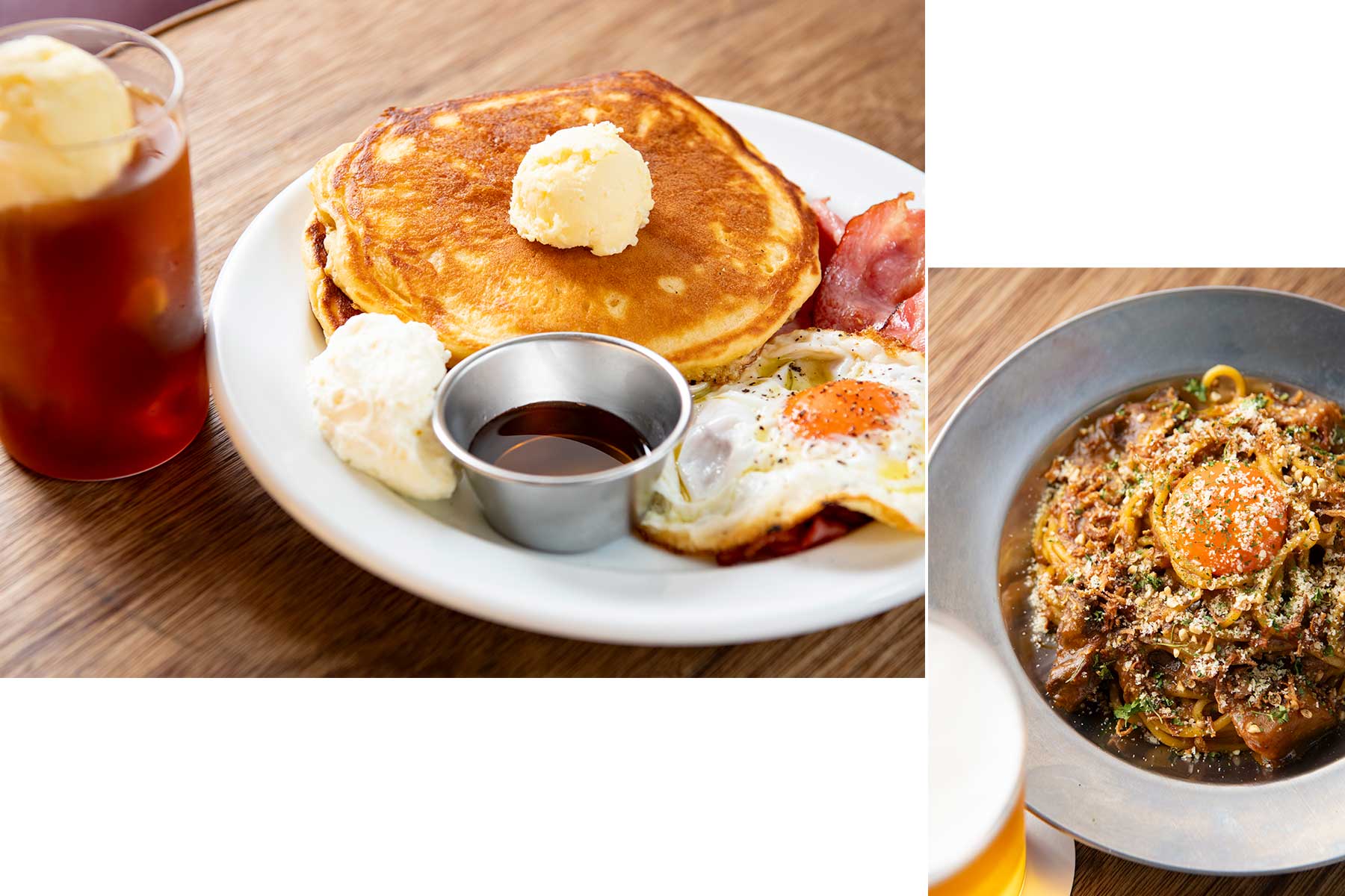 〈左〉サクッふわっモチッとした口当たりを出すために、生地の素材を独自に配合したパンケーキにホイップバターをオン。生クリームとメープルシロップ、ベーコンに目玉焼きを添えて甘じょっぱく楽しめる。パンケーキ ベーコン&エッグ¥1,850、コーヒーフロート¥800〈右〉生パスタにスパイシーなビーフカレーを絡めた一品はバータイムにオーダーしたい。インディアンパスタ¥1,600