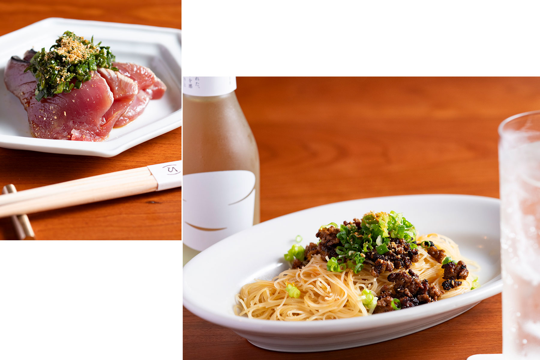 〈右〉合い挽き肉に生姜やねぎ、甜麺醤などを合わせ、しっかり焼き付けた肉味噌はカリッと香ばしく、お酒を誘う肴にも、軽く食せる〆の一品にもなるビーフン。日本酒をトニックウォーターで割った酒トニックと。〈左〉むっちりと旨みの強い鰹には程よくパンチがあるニラソースを。「手数をかけず、おつまみとして楽しめるように」と、別添えのつけダレではなくソースにする一工夫が。初回はお通し3品¥1,500+5品¥3,500のコースで、2回目以降はアラカルトOK。