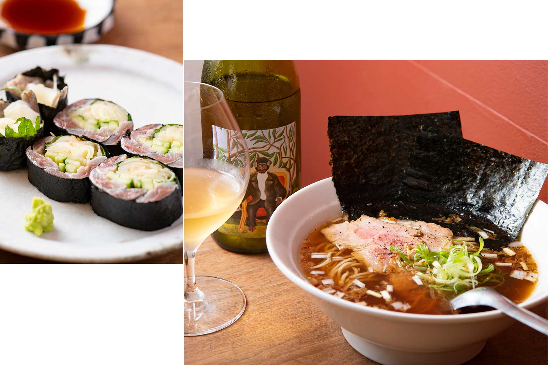 〈右〉福島県産蕎麦粉で打った麺と、かえしと出汁をあわせたつゆ。ここまでは真っ当なかけ蕎麦なのに、焦がしねぎ油をかけて自家製チャーシューを添えると、お酒のアテにも〆にもなるどこかラーメン風の味わい。中華そば¥1,300、グラスワイン¥1,000~〈左〉まろやかな酸味が引き出す鰯の旨みと、ガリや大葉の風味が一体に。酢〆鰯ののり巻き¥1,200