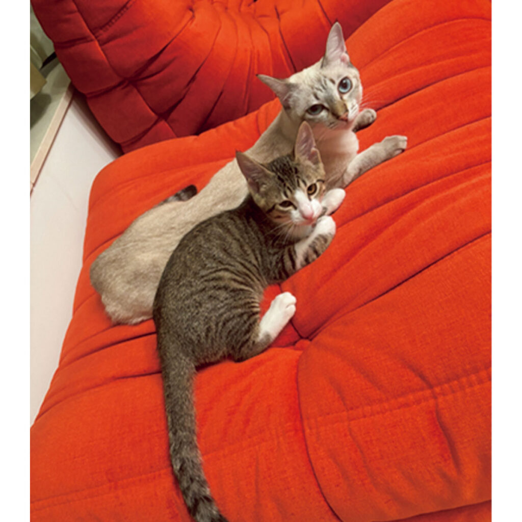 昔から完全に猫派で、今も女のコと男のコ、2匹の猫と暮らしています。どちらもベタベタされるのは好きじゃないのですが、昼間は爆睡しているので、その隙を狙ってお腹に顔を埋めています。猫によって匂いが違うところも癒されるポイント。可愛くて仕方ないですが、男のコは本当にやんちゃ。女のコのごはんを食べちゃうし、イタズラも絶えず、昨日も餌皿を落として割って大騒ぎしていました(笑)。