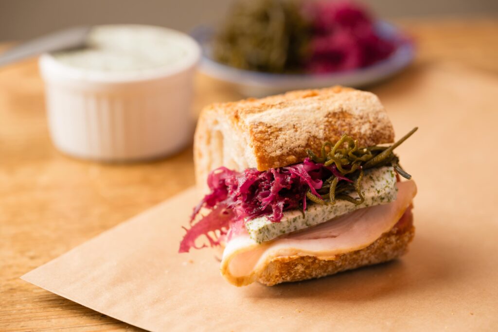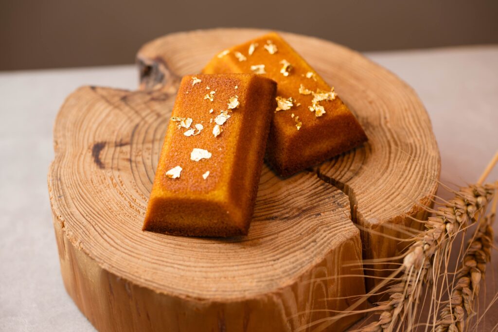 bricolage bread & co.のプロデューサーであり、ミシュラン三つ星レストランのレフェルヴェソンスのエグゼクティブシェフとして知られる生江史伸シェフによるフード2種。1枚目から、大麦粉を使用して焼き上げ金箔を散らした“金のフィナンシェ”、スジオアノリを使用した自家製の海藻バターと沖縄のTESIOによるハムを全粒穀粉バゲットに挟み、ピクルスを添えた“海藻のジャンボンブール”。味覚から思考が広がる「AWT BAR」ならではのメニュー。