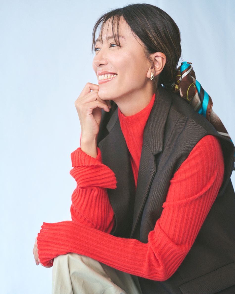 ニット¥29,700(エンリカ) ベスト¥36,300 パンツ¥23,100(ともにティッカ)靴¥64,900(ネブローニ) スカーフ¥22,000(マニプリ) イヤリング・靴下/スタイリスト私物