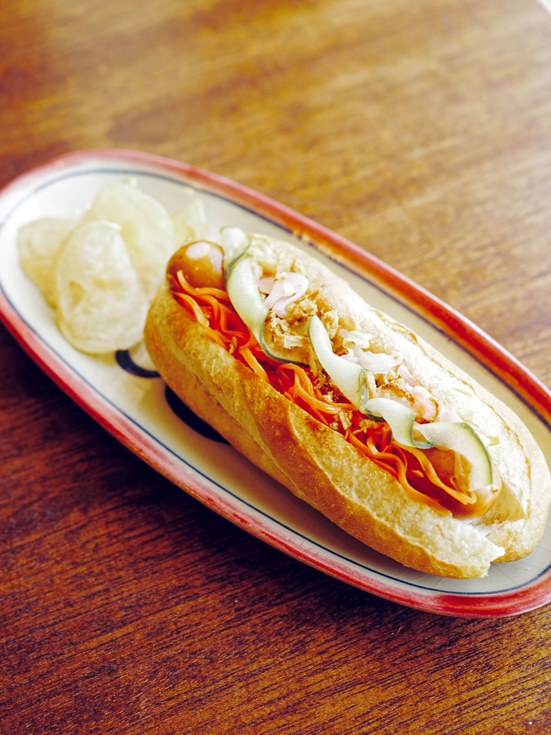 食べた人は必ずファンになるという人気メニューの「ホットドッグ」には、お店のこだわりがたっぷり。新宿御苑にあるベーカリー「ラ・バゲット」にカスタムオーダーしたパンに挟まるのは、豪徳寺にある自家製ハム・ソーセージの専門店「冨永オリジナルデリカテッセン」が「in the MIDDLE」のためにカスタマイズしたボリュームたっぷりのソーセージ! 自家製のキャロットラペ、ザワークラウト、ピクルスのほどよい酸味がソーセージの旨みをさらに引き立て、食べ始めたら止められないおいしさ♡