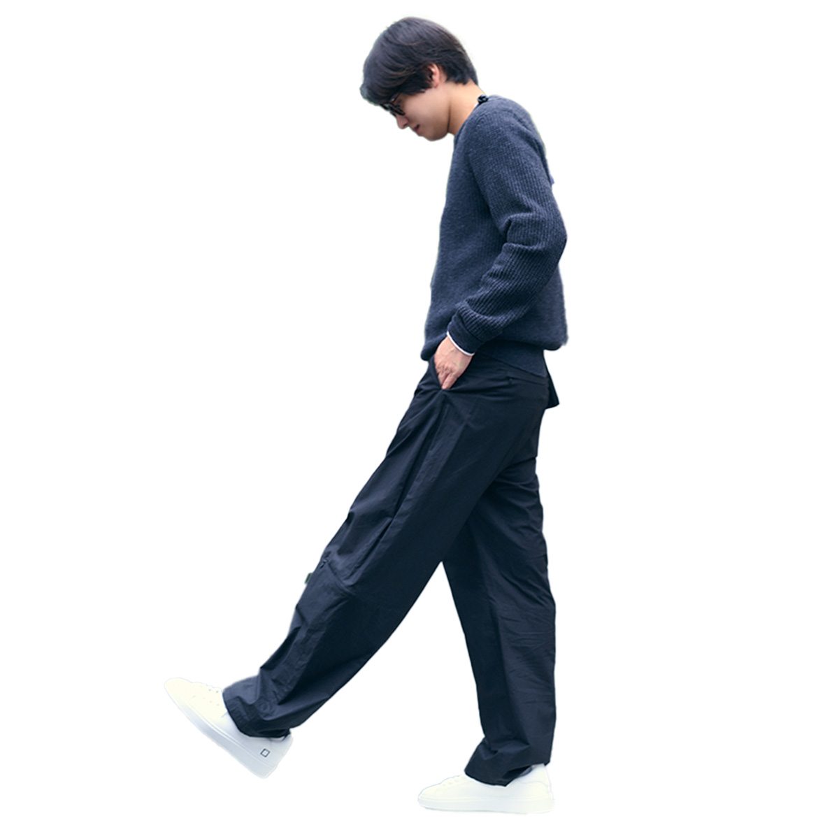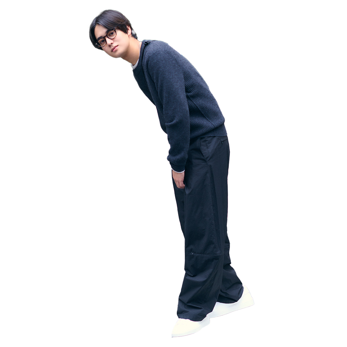 ニット¥30,000(バナナ・リパブリック)中に着たカットソー¥9,240(L.L.Bean Japan Edition/L.L.Bean カスタマーサービスセンター)パンツ¥45,100(AMOMENTO)バッグ¥6,600(remer/remer store)靴¥35,200(デイト/ティースクエア プレスルーム)メガネ¥42,900(アイヴァン/アイヴァン 東京ギャラリー)ネックレス¥3,300〈ライオンハート〉リング¥55,000〈シンゴクズノ〉(ともにSian PR)