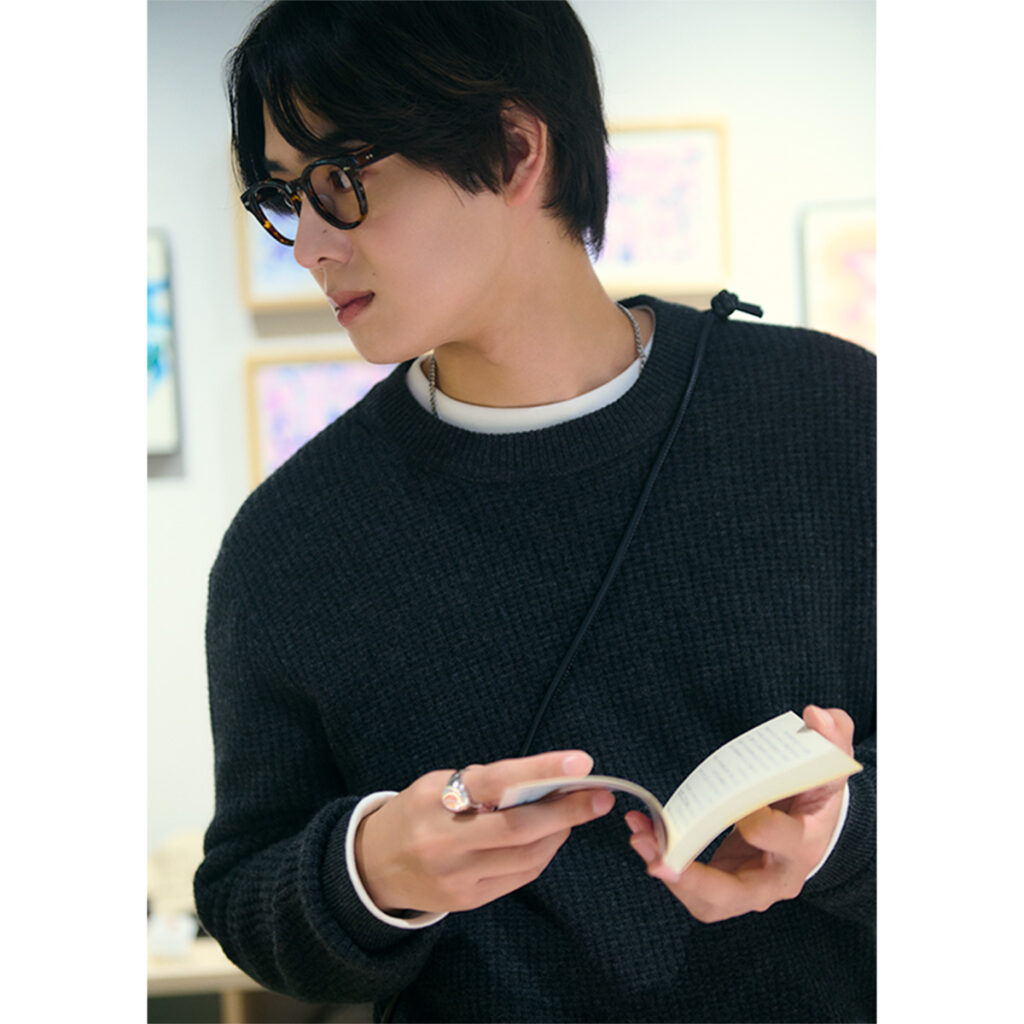 ニット¥30,000(バナナ・リパブリック)中に着たカットソー¥9,240(L.L.Bean Japan Edition/L.L.Bean カスタマーサービスセンター)バッグ¥6,600(remer/remer store)メガネ¥42,900(アイヴァン/アイヴァン 東京ギャラリー)ネックレス¥3,300〈ライオンハート〉リング¥55,000〈シンゴクズノ〉(ともにSian PR)
