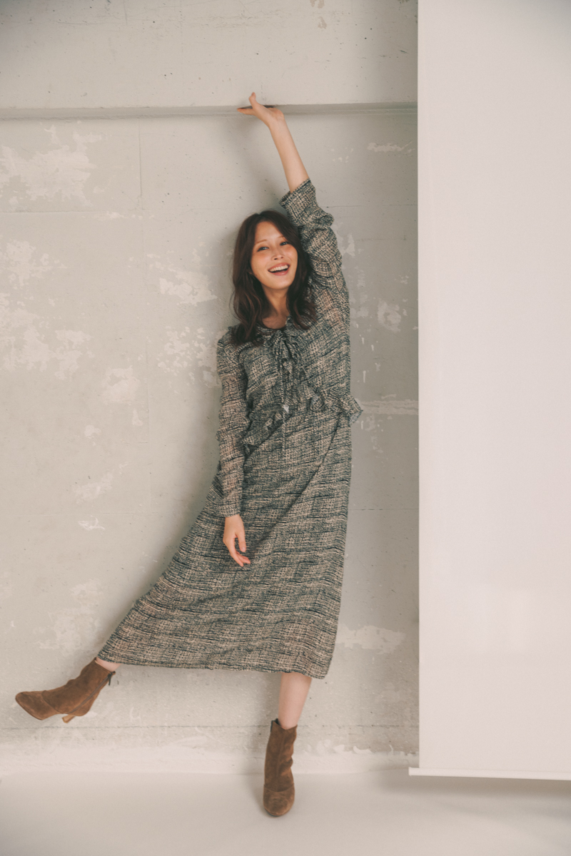 ワンピース¥61,600(BAUM UND PFERDGARTEN/バウム・ウンド・ヘルガーテン)ショートブーツ¥48,400(YOSHITO/ヨシト)ピアス¥20,900(MAYU/マユ)