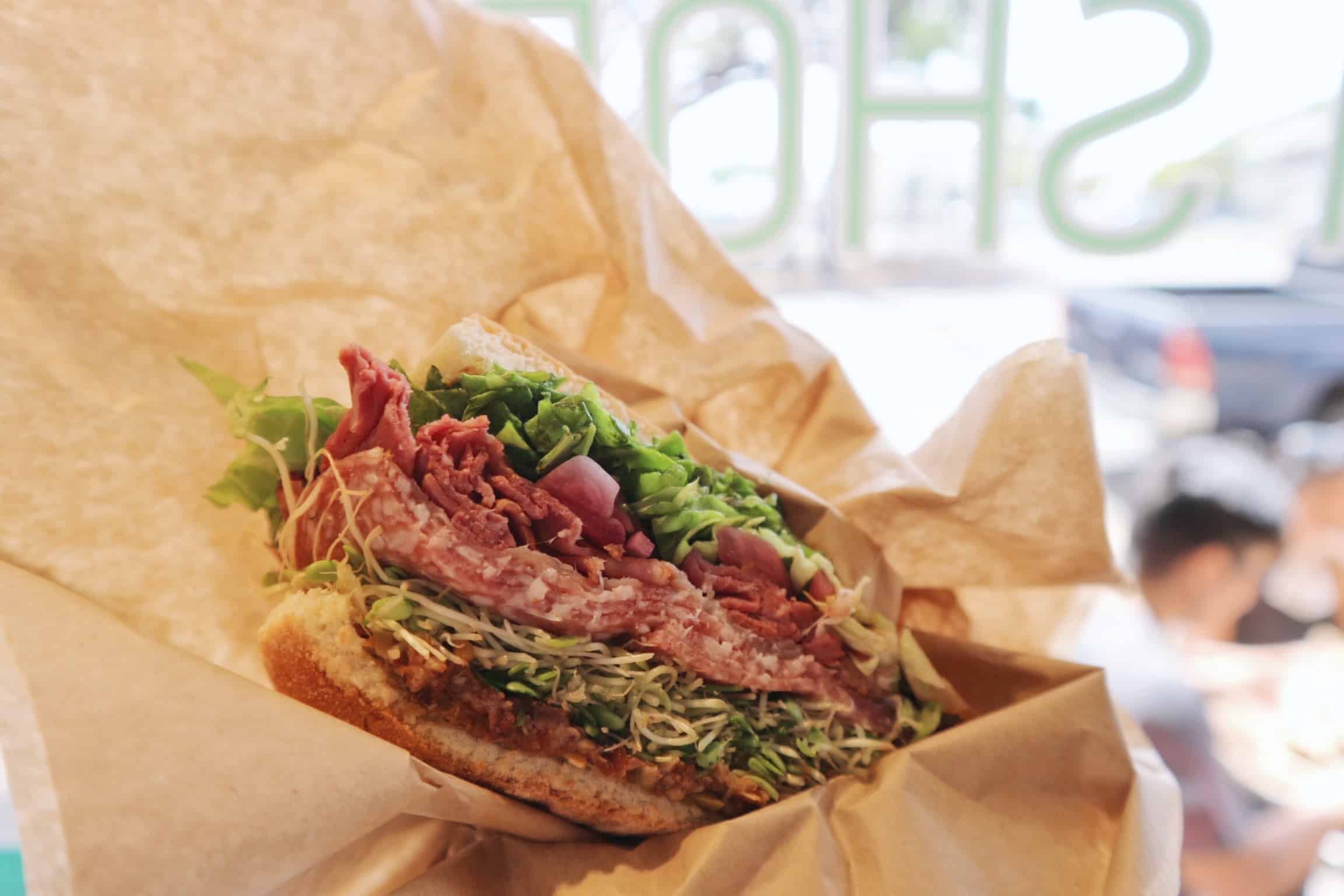 パストラミとプロシュート、スプラウト、マウイ産のレタスなどがたっぷり入った絶品サンドイッチ!