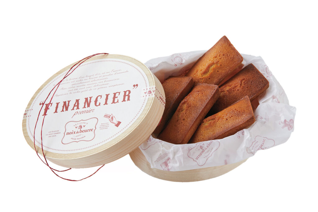 「ショップから漂うバターの香りに誘われて、思わず立ち寄りたくなるほど。素材を生かした作りたてのお菓子にこだわる『ノワ・ドゥ・ブール』の看板商品が、次々と焼き上がるフィナンシェです。ローストしたスペイン産のマルコナ種アーモンドプードル、程よく焦がした国産発酵バター、風味のよいきび砂糖を味の要にした逸品は、外はこんがりカリカリ、中はしっとり。香り高く、豊かなコクが口いっぱいに広がります。蓋を開けるのも心躍るわっぱのパッケージに詰めれば、鉄板の手土産に」(Demi-Luxe BEAMSディレクター・目黒越子さん)