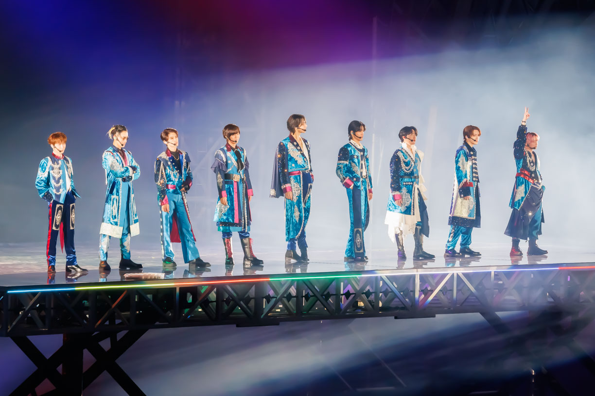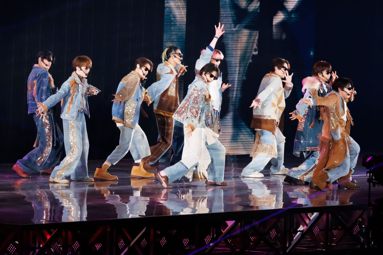 赤や緑、紫などのカラフルな色使いにゴールドの箔やスパンコールなどが施された煌びやかな衣装に着替えたメンバーたち。目黒さん・渡辺さん・阿部さん・向井さんの4人がタップダンスを披露したかと思えば、岩本・佐久間・目黒・渡辺(上手)/阿部・深澤・宮舘・向井・ラウール(下手)にわかれたメンバー全員がなんとポールダンスで『Dangerholic』を歌唱!色気たっぷりのパフォーマンスで会場を魅了し、曲終わりに岩本さんがバク転を披露すると大歓声が沸き起こります。『Miss Brand-New Friday Night』では、バックステージからパフォーマンスがスタート。ステージがセンターへと移動する中、見つめ合う阿部さん・佐久間さんに惹きつけられていると、なんとステージが2つにセパレート!それぞれ上段(阿部・岩本・佐久間・宮舘・向井)・下段(深澤・目黒・渡辺・ラウール)に分かれたメンバーたちは爽やかなサウンドに合わせてしなやかなダンスで魅せました。