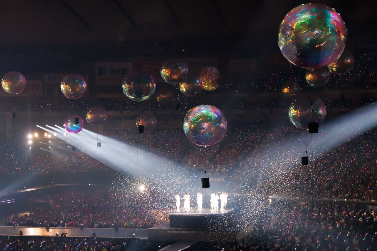 『愛のせいで』ではメインステージからの花道を歩き、9人でセンターステージに向かいます。3段に分かれるステージで、ラウールさんはステージの一番上へ。佐久間さんが伸びのある美声を響かせると、会場にはどこからともなく数々のバルーンが浮かび上がります。ステージでは、下段にいる向井さんに佐久間さんが手を差し出しエスコートする姿や、そのまま宮舘さんと肩を組む3人の姿も。肩を組んで歌い上げる岩本さん・深澤さんに、にこやかな表情の渡辺さん。計45個のバルーンが大サビでさらに高く上昇すると、雪のような真っ白な紙吹雪が9人と観客を包みます。あまりにも幻想的な空間の中、口をつぐむラウールさんや、笑顔でファンへ手を振る阿部さん、目黒さん。最後まで会場に集まったファン一人ひとりへの感謝の想いを届け、メンバーが会場を後にします。高く浮かんだバルーンがメンバーカラー9色のレーザーに照らされる中、エンドロールの最後に【Very Thanks to ALL FANS!】のメッセージを残したSnow Man。こうして東京初日公演が終了しました。