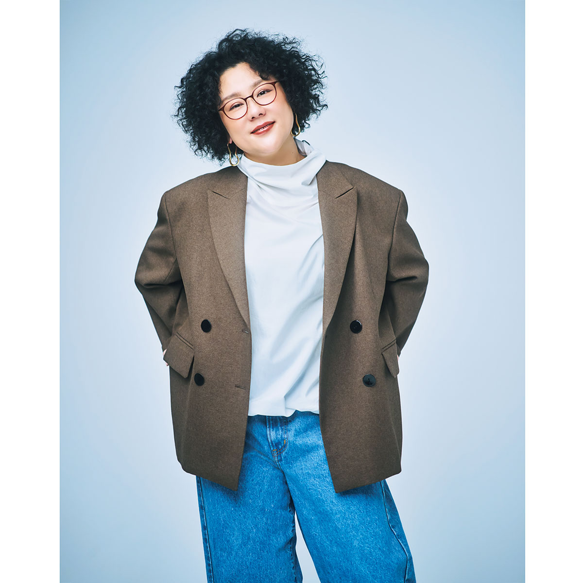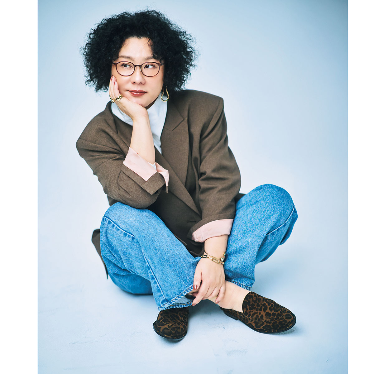 【衣装クレジット】ジャケット¥29,700(HeRIN.CYE)ブラウス¥53,900(エイトン/エイトン青山)デニムパンツ¥22,000(ニードバイヘリテージ/ゲストリスト)ローファー¥161,700(ピエール アルディ/ピエール アルディ 東京)ピアス¥41,800スクエアリング¥33,000リング¥46,200バングル¥41,800チェーンブレスレット¥73,700(すべてブランイリス/ブランイリス トーキョー)