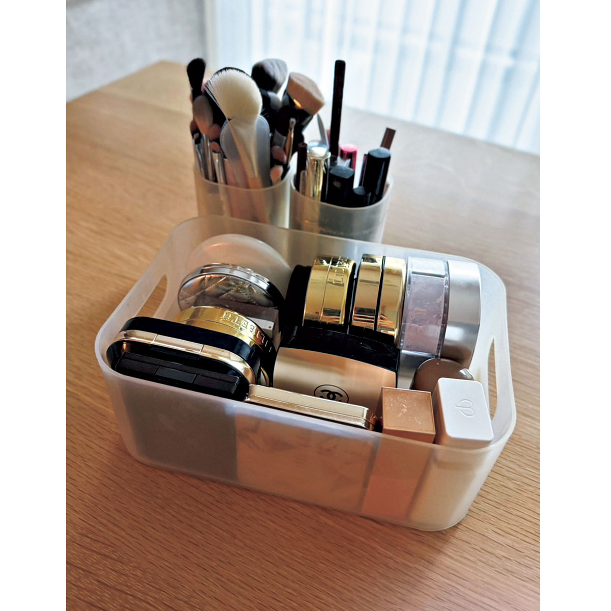 「引き出しにはパレットやリップを、ペン立てにはペンタイプのコスメやブラシなどを収納して、積み重ねて使っています。同じブランドやメーカーで統一すれば、キレイにフィットして自分仕様の収納ボックスが完成するのが好きなポイント。汚れがついてもすぐに洗えるので、常に清潔な状態で保管できます」(濱塚綾香さん/27歳・金融関係)