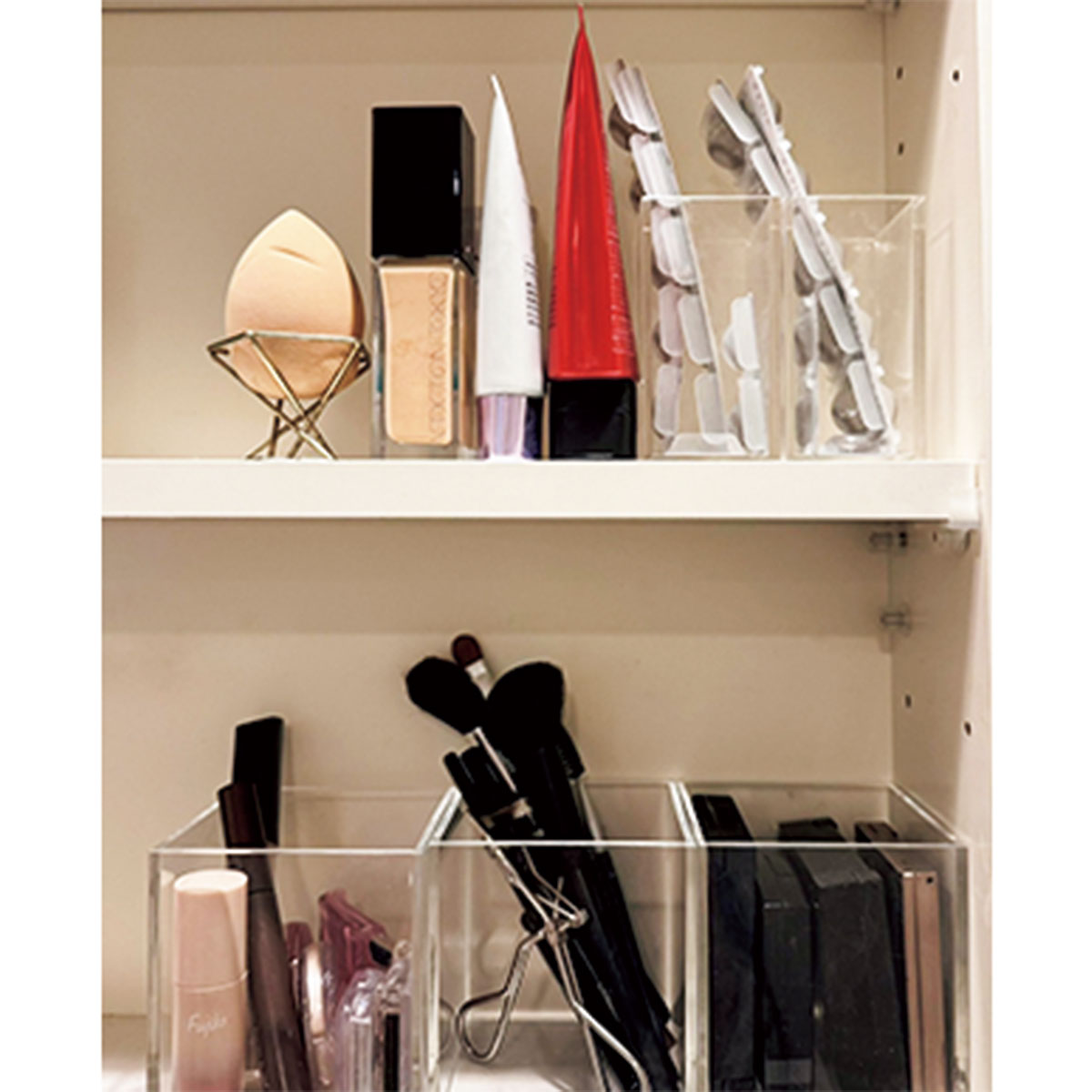 「アクリルケースはコスメ仕分けにはピッタリ。クリアだから目に見えてアイテムもわかりやすく、定期的に整理整頓するのが好きなのでとても使いやすいです。いつもカテゴリーごとに分けて収納しています。重ねて2段にしたり、いろいろ組合せを工夫できたりするのもいい!」(新居芙美恵さん/31歳・アパレル関係)