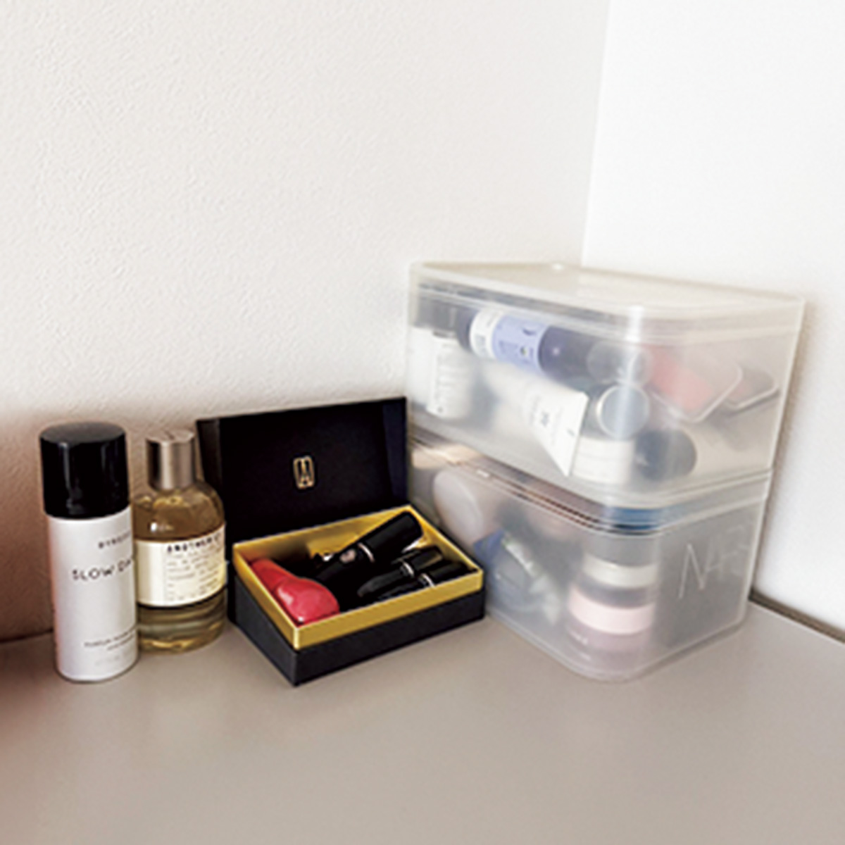 「ボックスを積み重ねるなら、別売りのフタはマスト。下段はストック、上段はデイリーと、大雑把に入れてもまとまった感じが出るし、毎日のメークもしやすいです。リップだけはすぐに入れ替えたり複数持ち運んだりがしやすいよう、別箱へ収納しています」(東井みなみさん/28歳・広告代理店)