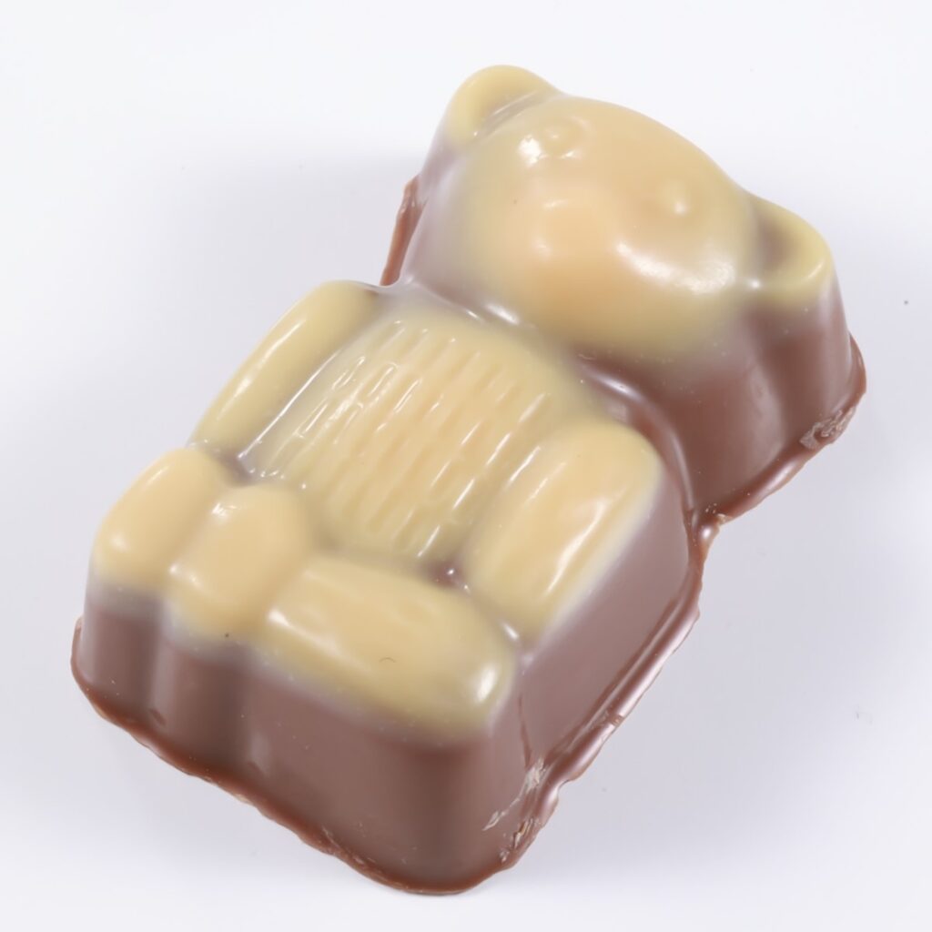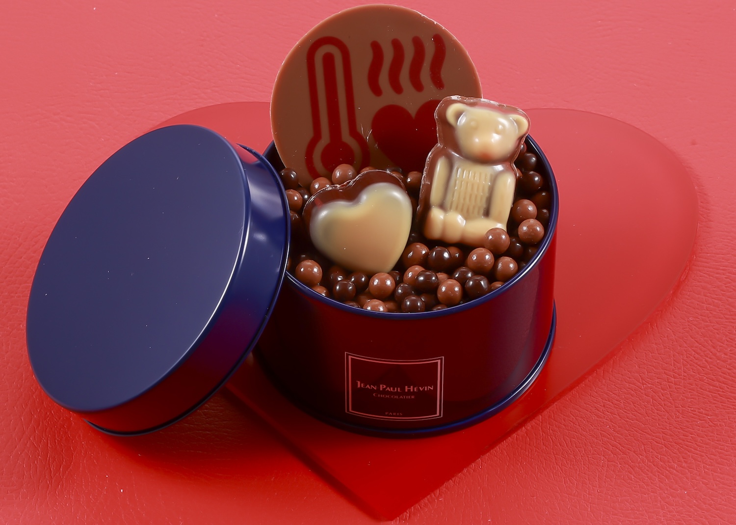 ハートのデザインを施したパレと、クマの形のショコラ、ハートのショコラ、ペルル クラッカントゥをブルーの缶に詰合せ。