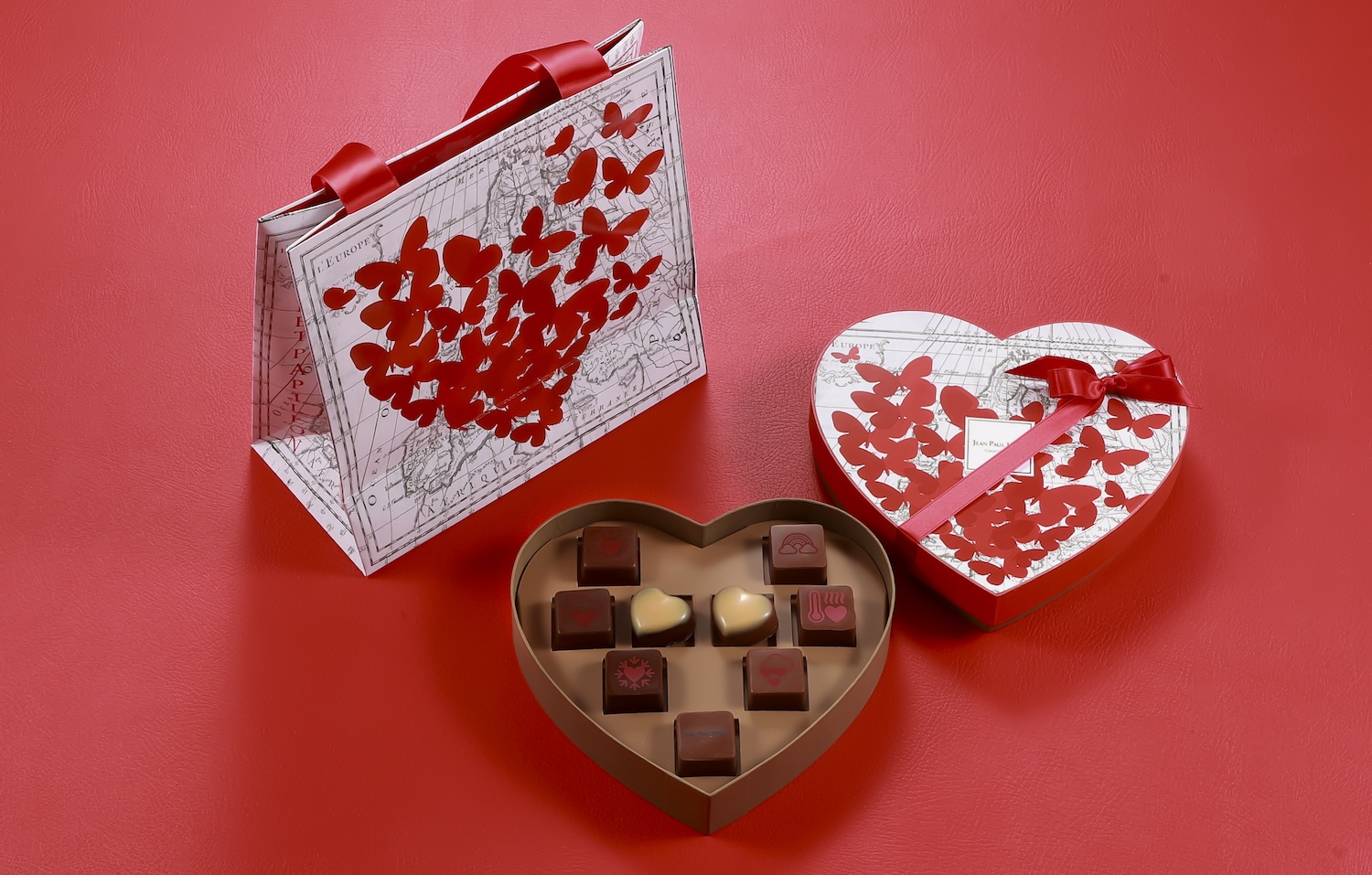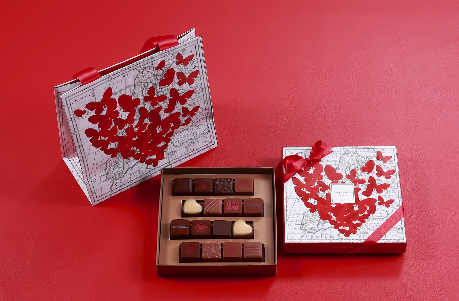 特別な人への贈り物や、この時季ならではの手土産としておすすめなのが、眺めているだけで気分が高まる、王道の詰め合わせボックス。前出の限定ボンボン ショコラや、定番のボンボン ショコラがセレクトされ、パッケージも華やか! バタフライで表現したハートモチーフなど、限定デザインが特別感を演出します。