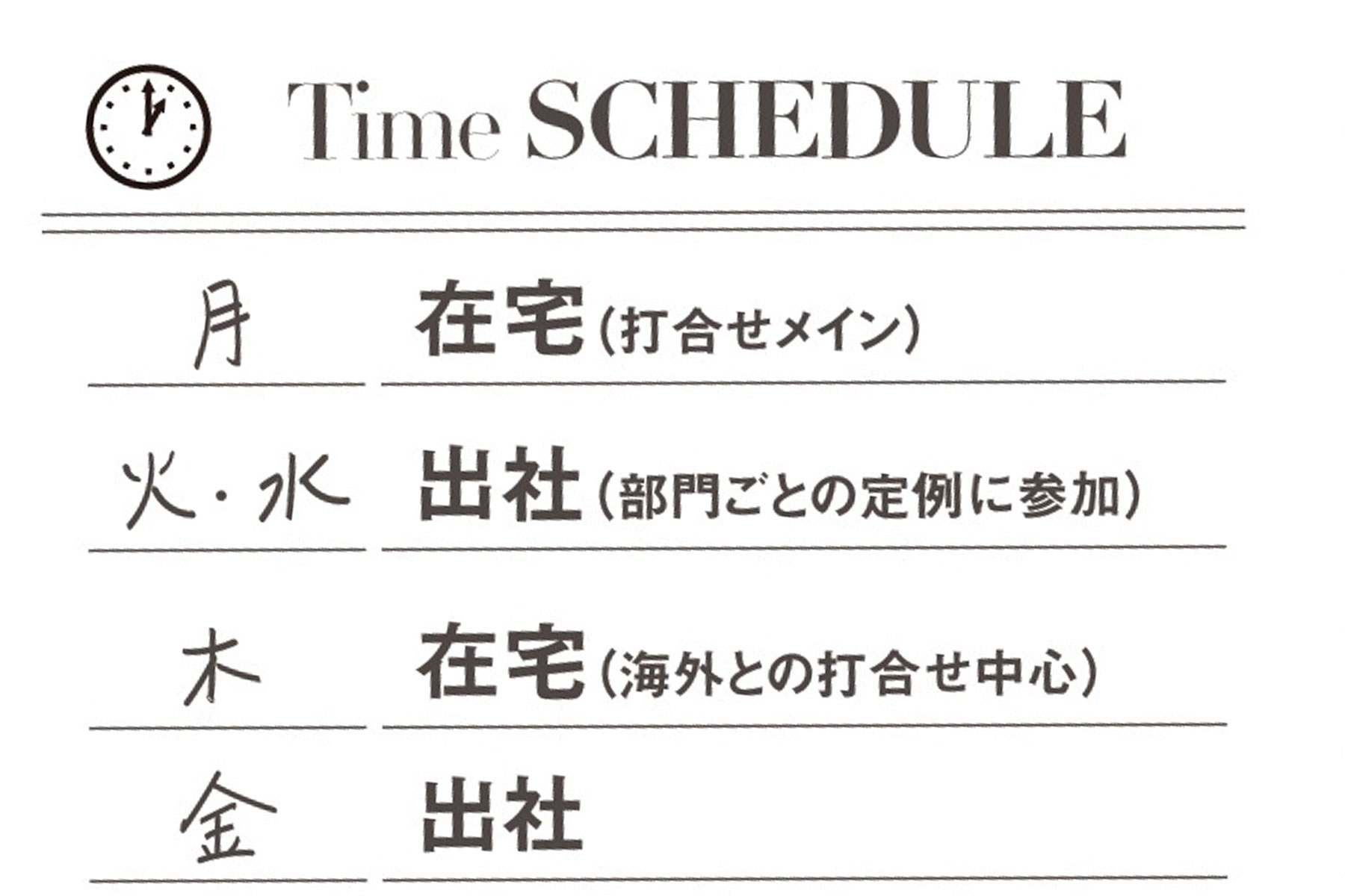 働き方は職種や部門の裁量次第で様々。最も効率的にベストなパフォーマンスを発揮できるスタイルが、部門ごとに決められています。私は現在、兼務でアジアのインクルージョンチームにも所属しており海外とのwe b会議は自宅の方がディスカッションしやすいので、1日にまとめて在宅で対応。ビジネスリーダーや、人事内の定例会議があるときは基本出社しています。