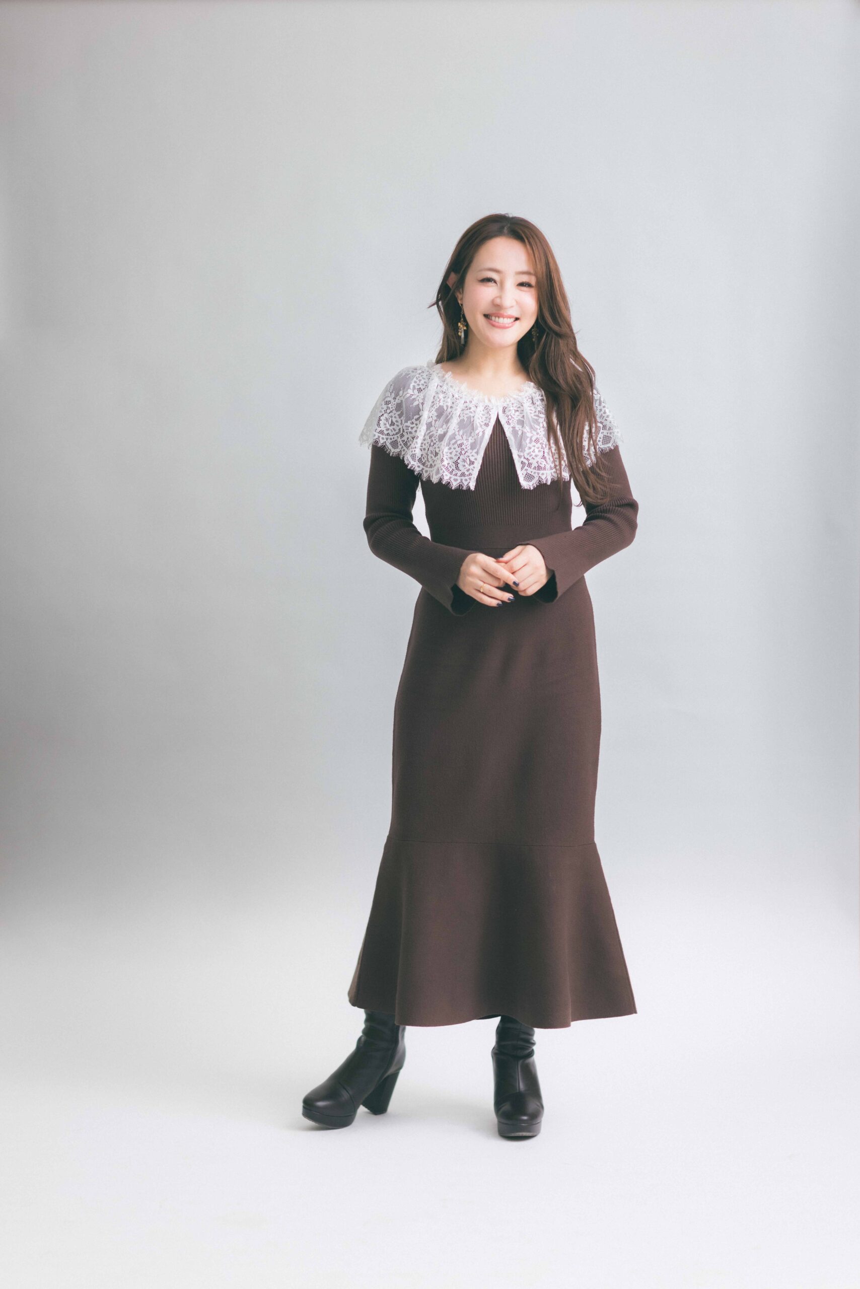 ワンピース¥14,300(トランテアンソンドゥモード/ダブルエー)ブーツ(スタイリスト私物)リング〈デイジールイス〉¥3,080イヤリング〈カオハンドメイド〉¥3,650(ともにロードス)