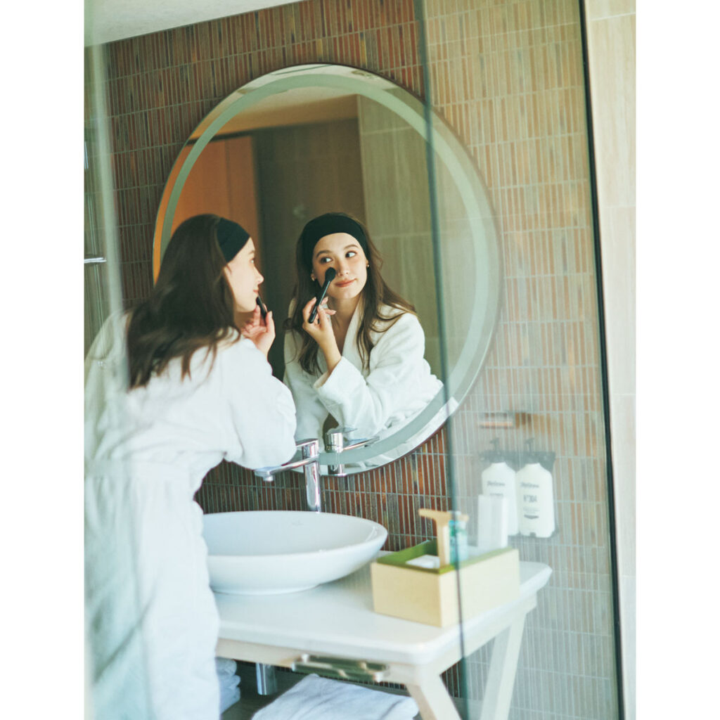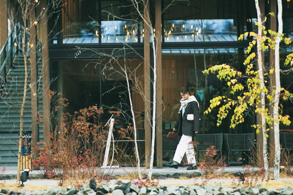 大自然に佇む洗練された空間で、CLASSY.世代の間でも話題のホテル。今回撮影したスイートルームでは、長野県の「すんき漬け」由来の乳酸菌を活用したオーガニックのスキンケアブランド「LOVE GIVES LOVE」のアメニティを導入。また、軽井沢のコーヒー専門店「MzCOFFEEラボ」監修のホテル専用ブレンド豆を用意。のんびりコーヒータイムを。