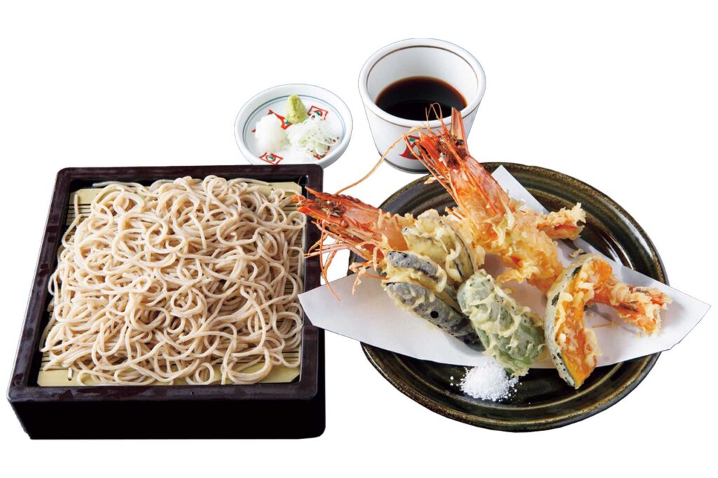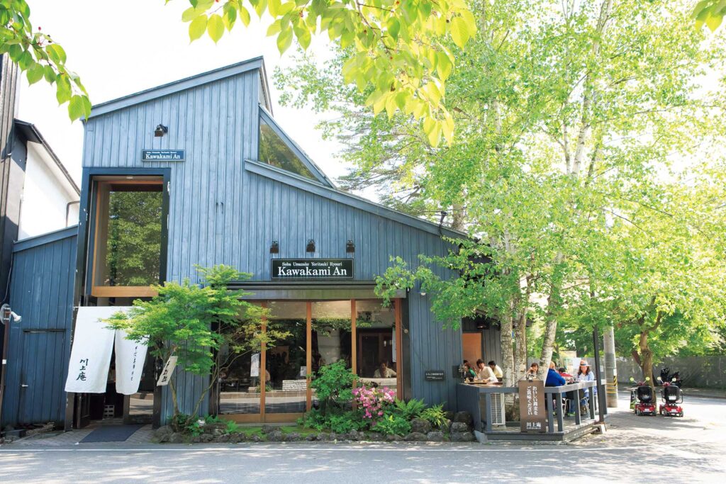 アウトレットからタクシーで約5分。カジュアルな外観が目を惹く軽井沢の有名店・川上庵で、名物の天せいろを堪能。遅めのランチを楽しめるのも嬉しい。