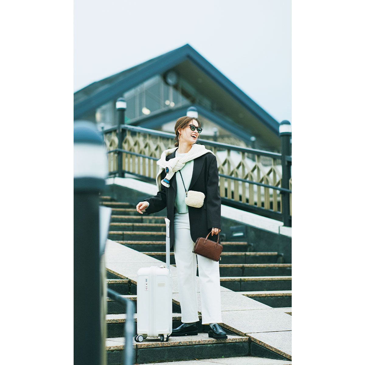 〈モデル衣装〉ジャケット¥24,000(PLST)ニット¥27,500(Theory/リンク・セオリー・ジャパン)ロンT¥11,550肩にかけたカーデ¥41,800(ともにスローン/ザ ショップ スローン 新静岡セノバ店)デニム¥27,500(ヤヌーク/カイタックインターナショナル)サングラス¥47,300(アイヴァン/アイヴァン 東京ギャラリー)ピアス¥42,900ネックレス¥58,300リング¥58,300(すべてマリハ)ショルダー¥34,650(テッセンクリエーション)バッグ¥31,900(トゥティエ)キャリーケース¥97,350(ボナベンチュラ)ソックス¥2,860(マルコモンド)ローファー¥31,900(カミナンド/グラビテート)