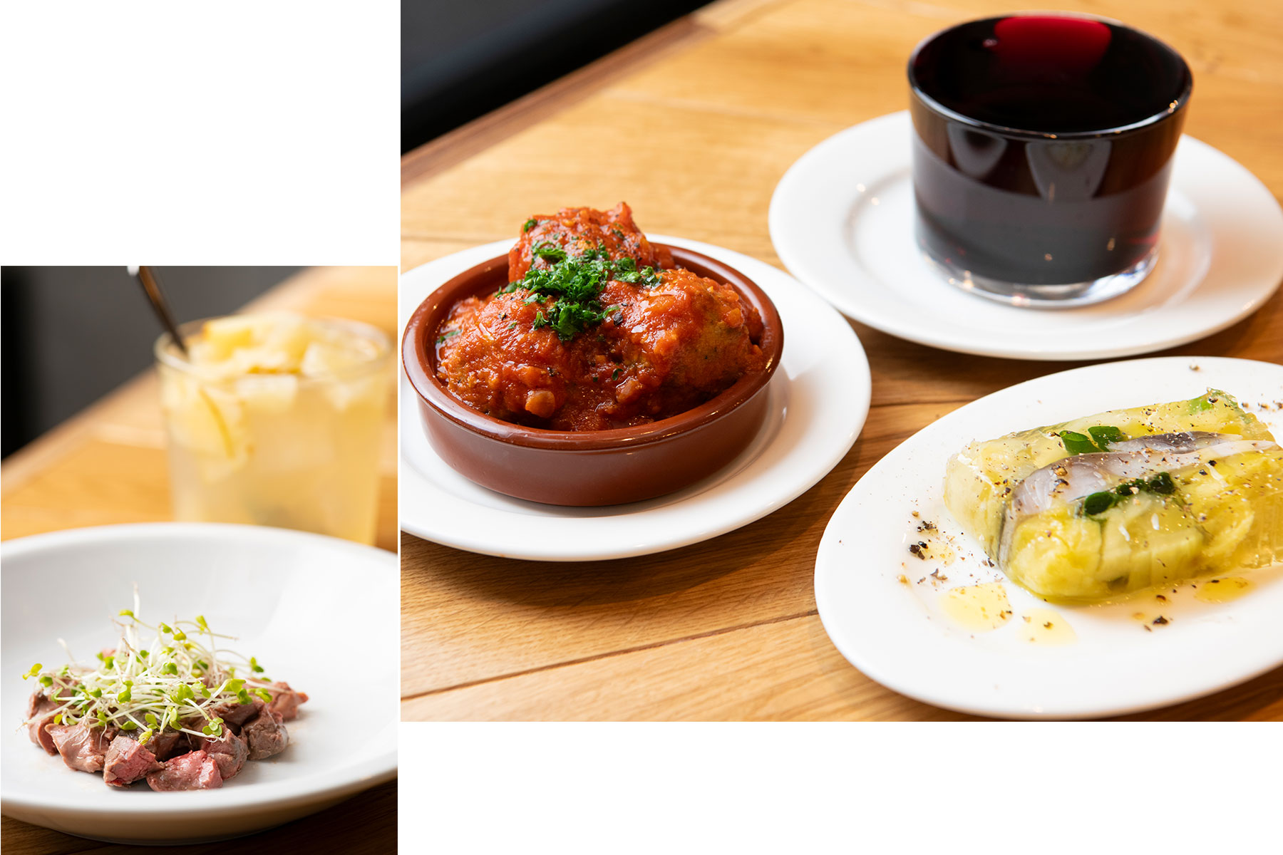 〈右〉豚肉と牛肉を合わせたミートボールは、クラッシュアーモンドの食感がアクセントになったソースで。スペイン風ミートボール アーモンドトマトソース¥680、〆さばと焼きなすのテリーヌ¥680、表面張力を最大限に生かしたなみなみワイン¥580。〈上〉低温で火入れした鶏レバーは海塩と胡麻油で味付けして、お酒がついつい進む一品に。鶏レバーのコンフィ¥680グレープフルーツとりんごをたっぷり漬け込み、フルーツごと供される自家製サングリア¥680