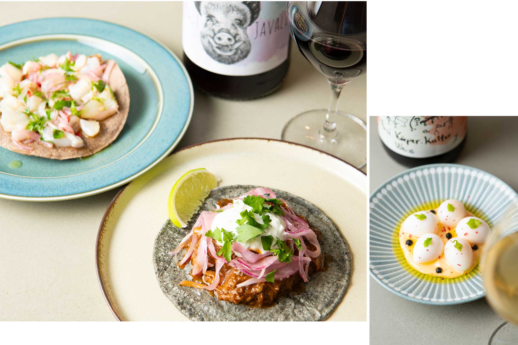 〈左〉スペシャリテのタコス、ラムシャンクのスパイス煮込み¥800。骨ごと7時間ほど煮込んだラムすね肉はほろっトロッと柔らかく、爽やかなヨーグルトベースのソースが力強い旨みを引き立てる。その時季ならではの素材や調理を取り入れる、季節の魚介タコス¥800。この日は鯛・タコ・帆立のセビーチェをのせて。グラスワイン¥900~〈上〉黄身がとろけるうずら卵には自家製マヨを添え、トリュフオイルと生胡椒をアクセントに。半熟うずらのウフマヨ¥500