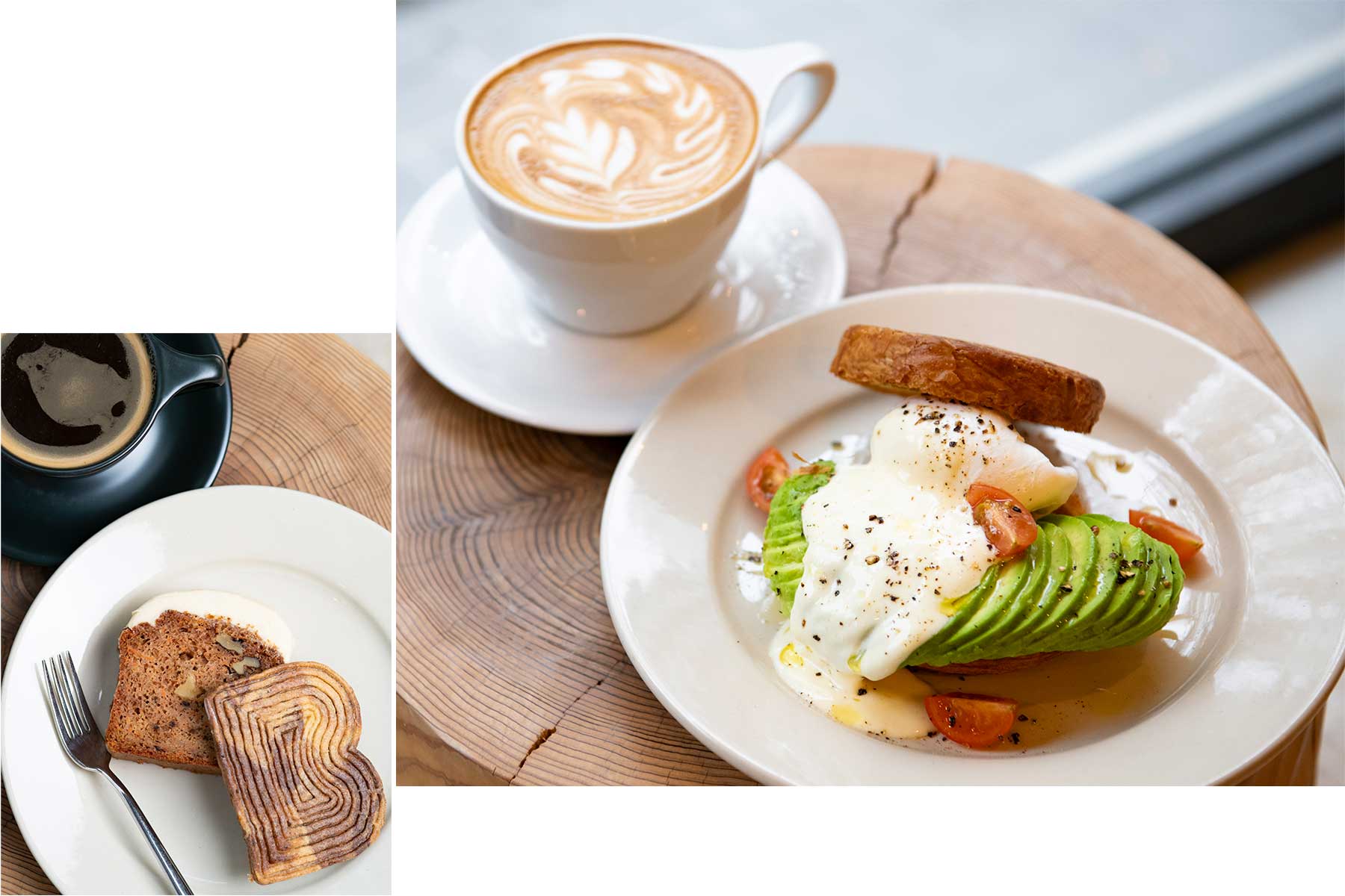 〈右〉バター香るクロワッサンにアボカドとポーチドエッグ、自家製ソースをあしらって。平日8時~13時限定のアボカドベネディクト¥1,600、ラテ¥700。〈上〉Bモチーフのシグニチャークッキーは自家焙煎のエスプレッソを練り込んだマーブル仕様。スパイス香るキャロットケーキは米粉で作るグルテンフリー。BARKクッキー¥400、チャイキャロットケーキ¥600、ロングブラック¥650