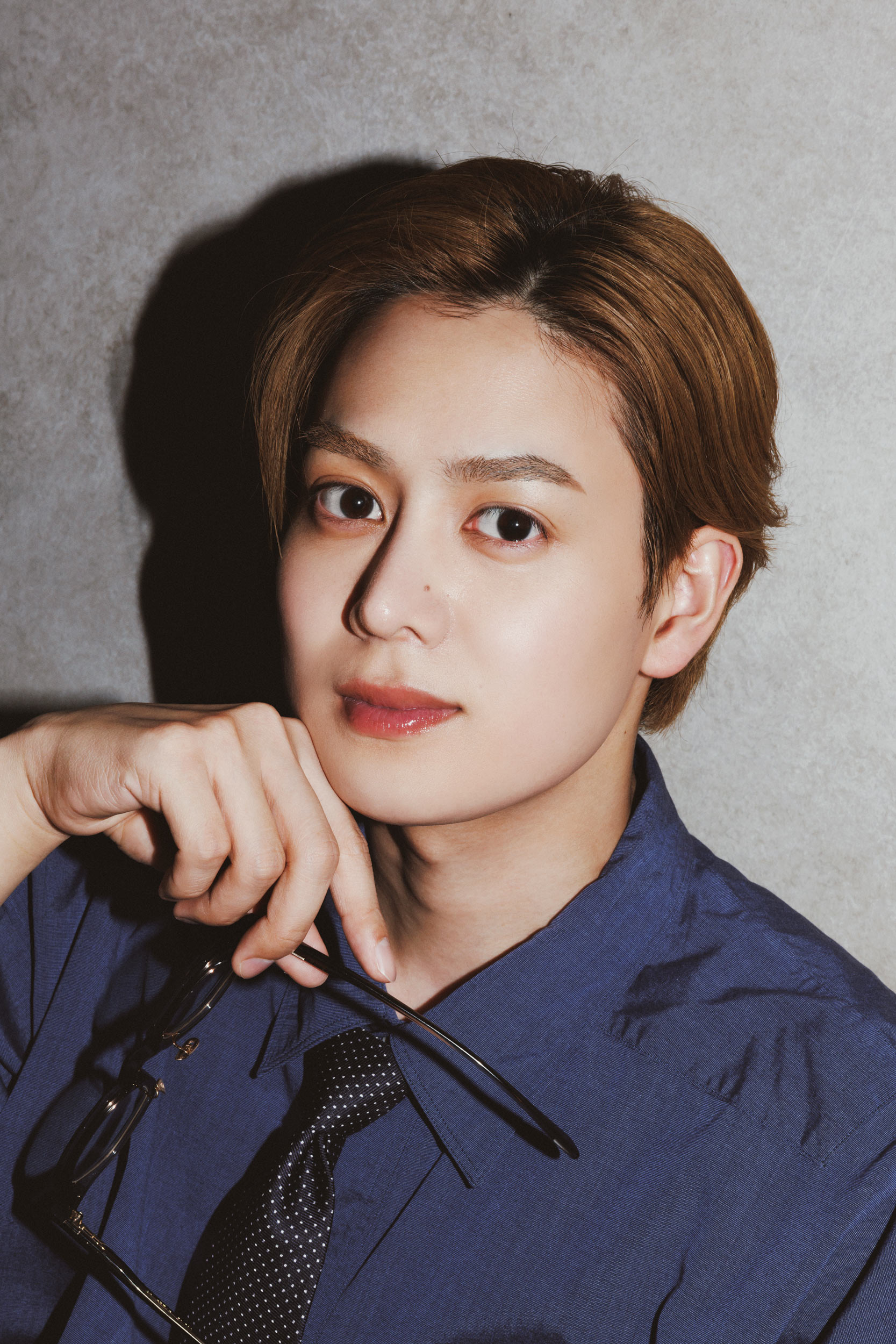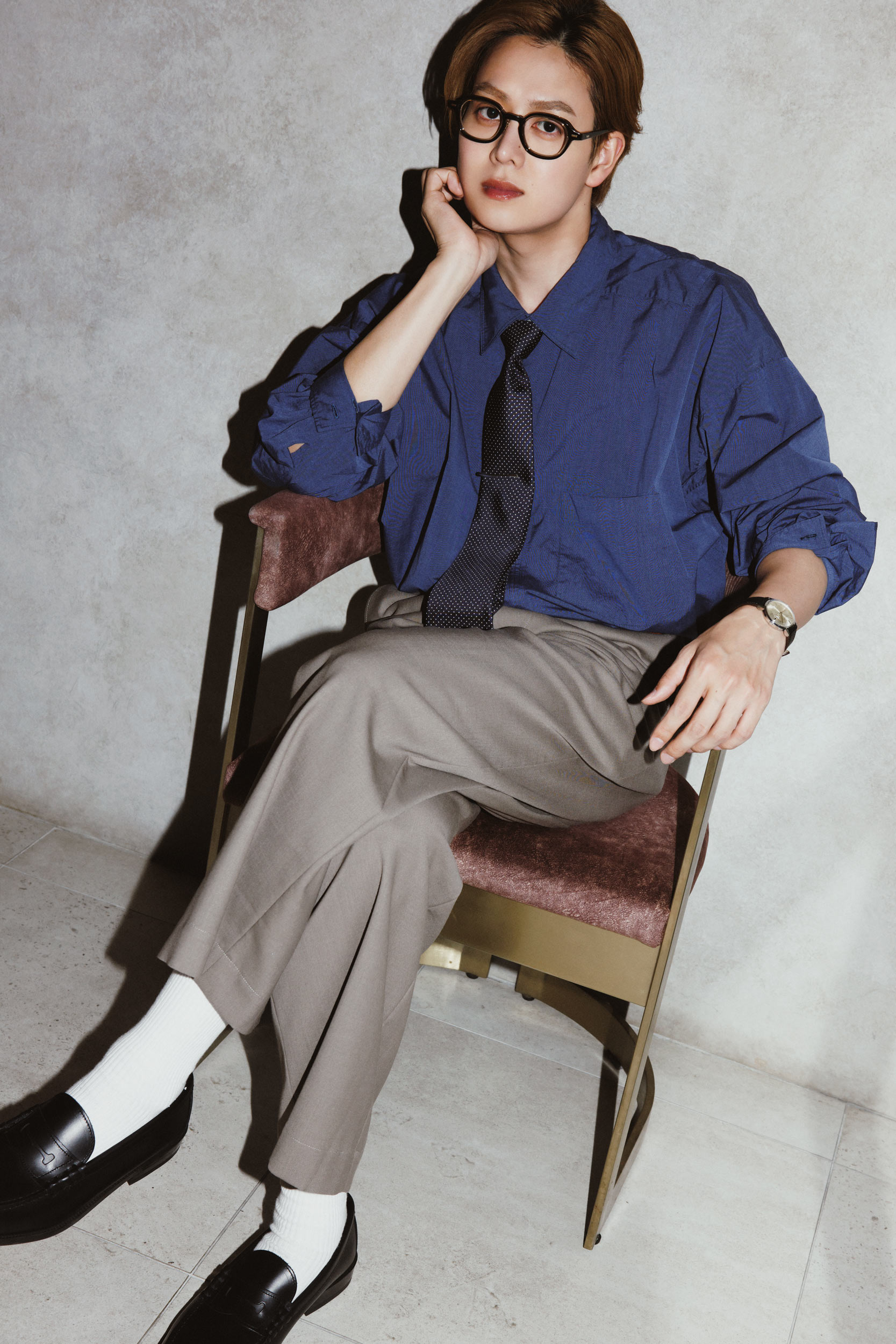 シャツ¥49,500(マービンポンティアックシャツメイカーズ/オーバリバー)パンツ¥49,500(エイトン/エイトン青山)メガネ¥55,000(ユウイチトヤマ/ユウイチトヤマ)タイ¥19,800(サウスウィック/エム・エス・ティー)時計¥404,800(江口洋品店・江口時計店 松濤)ソックス¥290(ユニクロ/ユニクロ)シューズ¥12,100(ハルタ/ハルタ)他スタイリスト私物