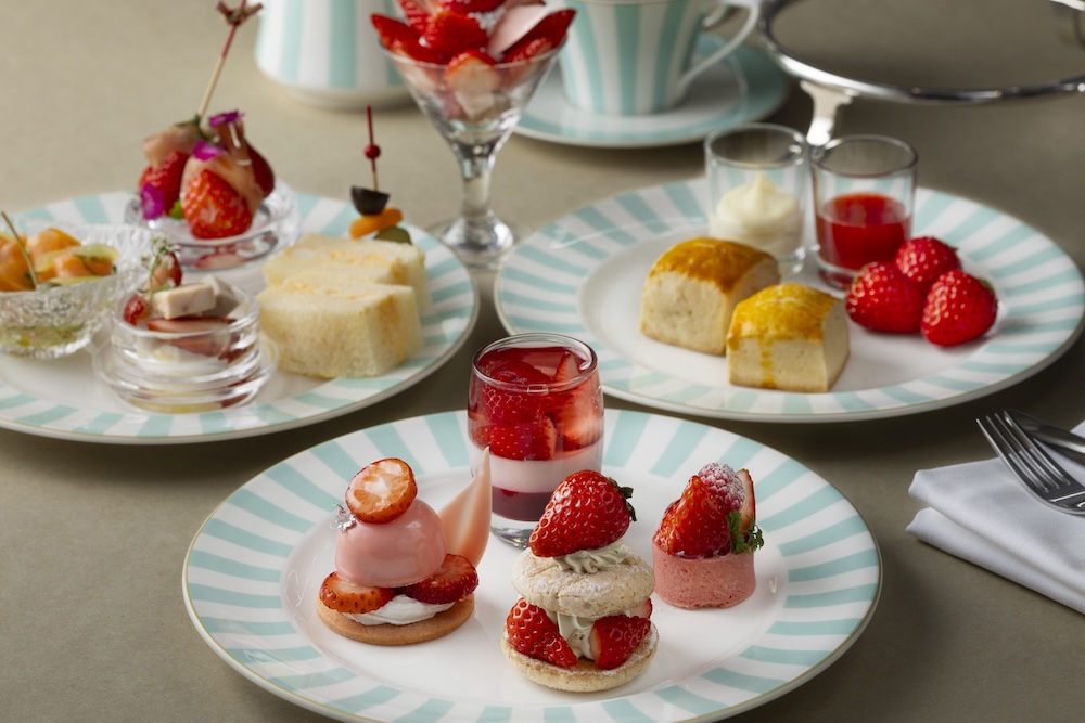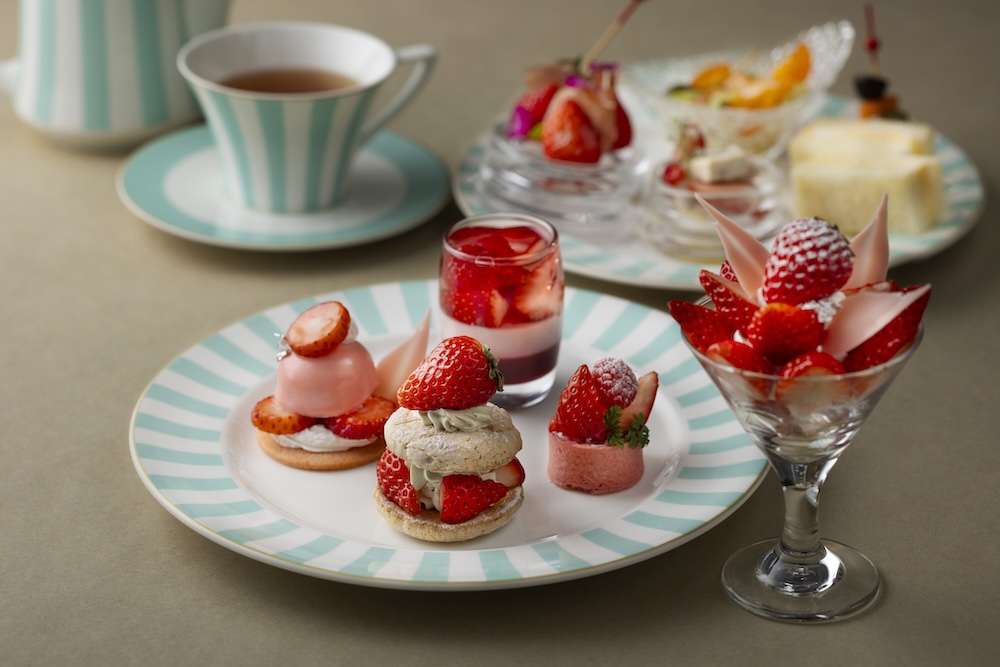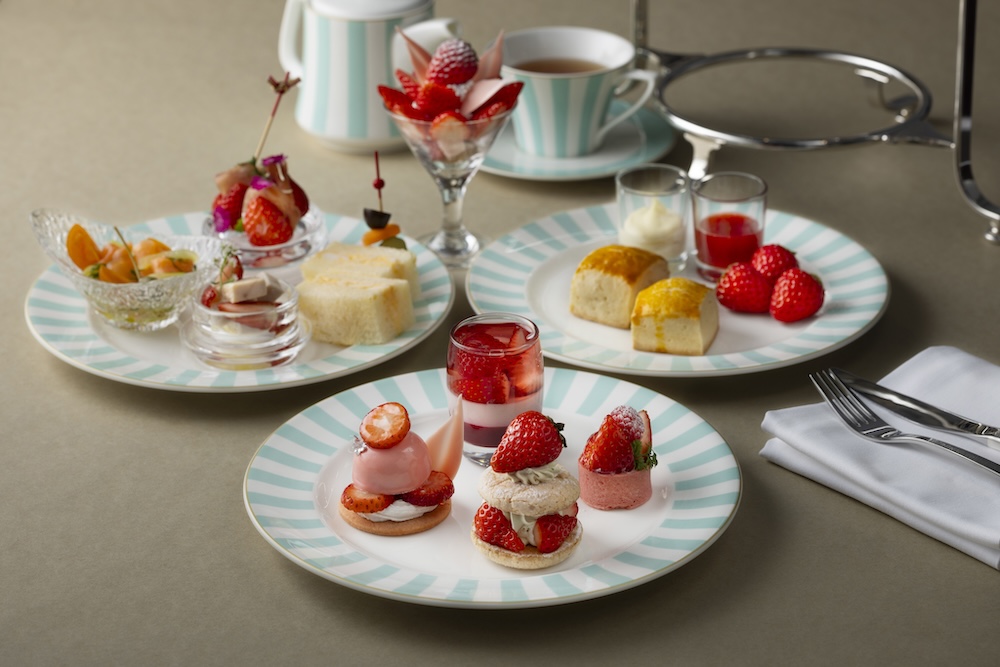 4月からのアフタヌーンティーは、ロビーラウンジで人気のミントブルーのポット&カップとリンクするストライプ皿が新登場。3段スタンドを華やかに彩ります。別皿のミニいちごパフェをはじめ、いちごとピスタチオのダックワーズ、いちごムース、いちごタルト、いちごのヴェリーヌなど、いちごを多彩にアレンジ。