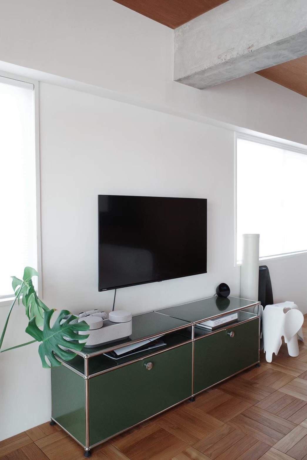 「昨年の夏に、自宅の購入とリノベーションをしたタイミングで購入しました。カラーは、インテリアショップ・MAARKETトーキョーとUSMのショールームでしかこれまで購入できなかった限定色のオリーブグリーンが、通常展開されるようになったと知り、オリーブに。人とあまり被らないカラーなので気に入っています。