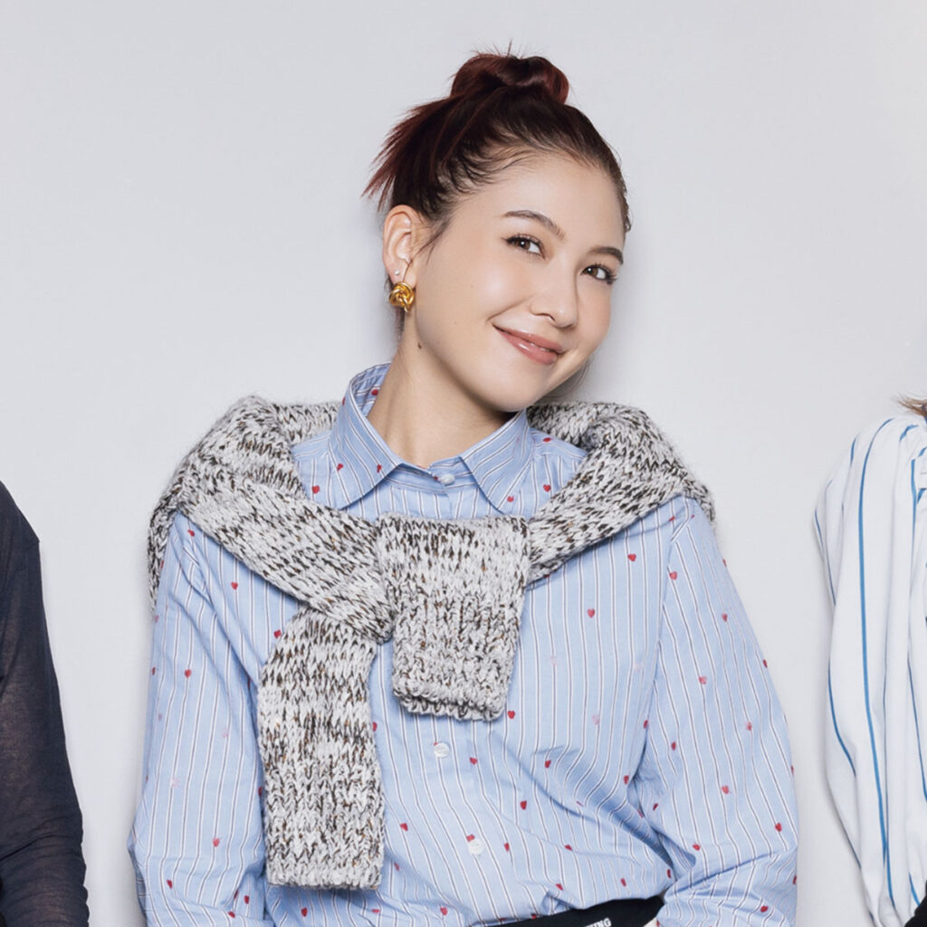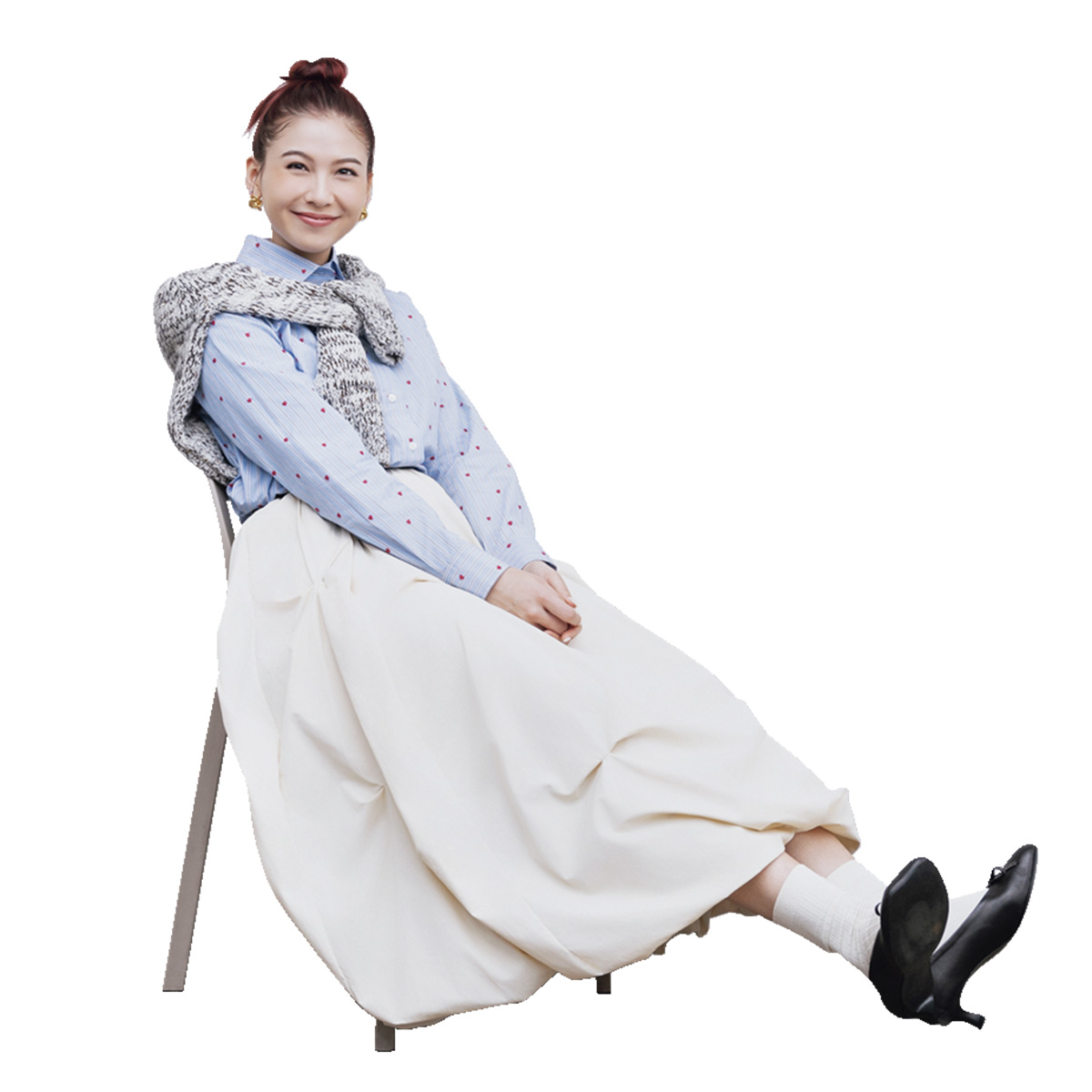 〈衣装クレジット〉長谷川ミラさん衣装/シャツ¥41,800スカート¥41,800〈ともにダブルスタンダードクロージング〉肩にかけたニット¥41,800〈ソブ〉(すべてフィルム)パンプス¥39,270(ウディレ/ハナ コリア)その他スタイリスト私物